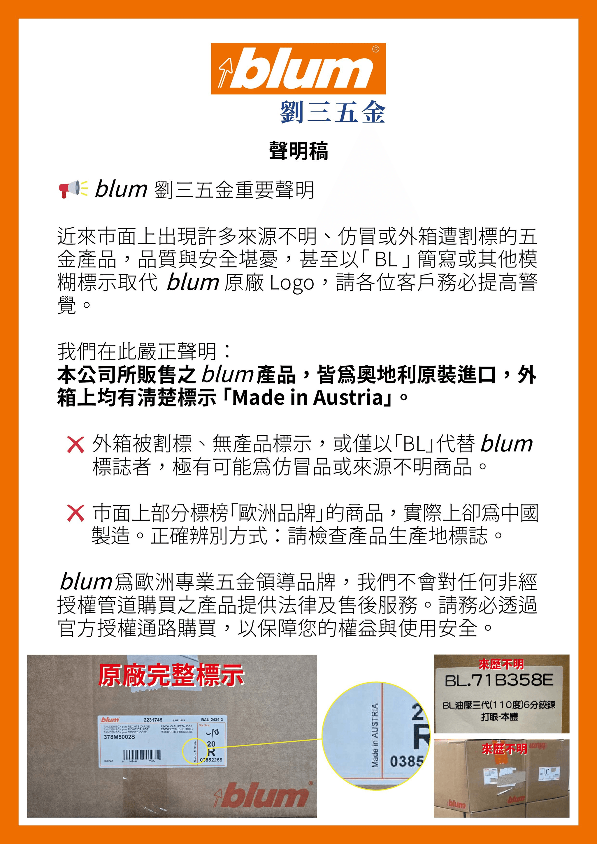 近期有偽造blum logo的仿冒品流入市面,緩衝背包的仿冒品最為氾濫。 請消費者多加注意:請勿購買來路不明的blum五金產品,以免損害自身權益 ‼️ 劉三五金為獨家奧地利blum五金台灣唯一總代理,透過本公司訂購才能享有最完整的保障以及售後服務。 |