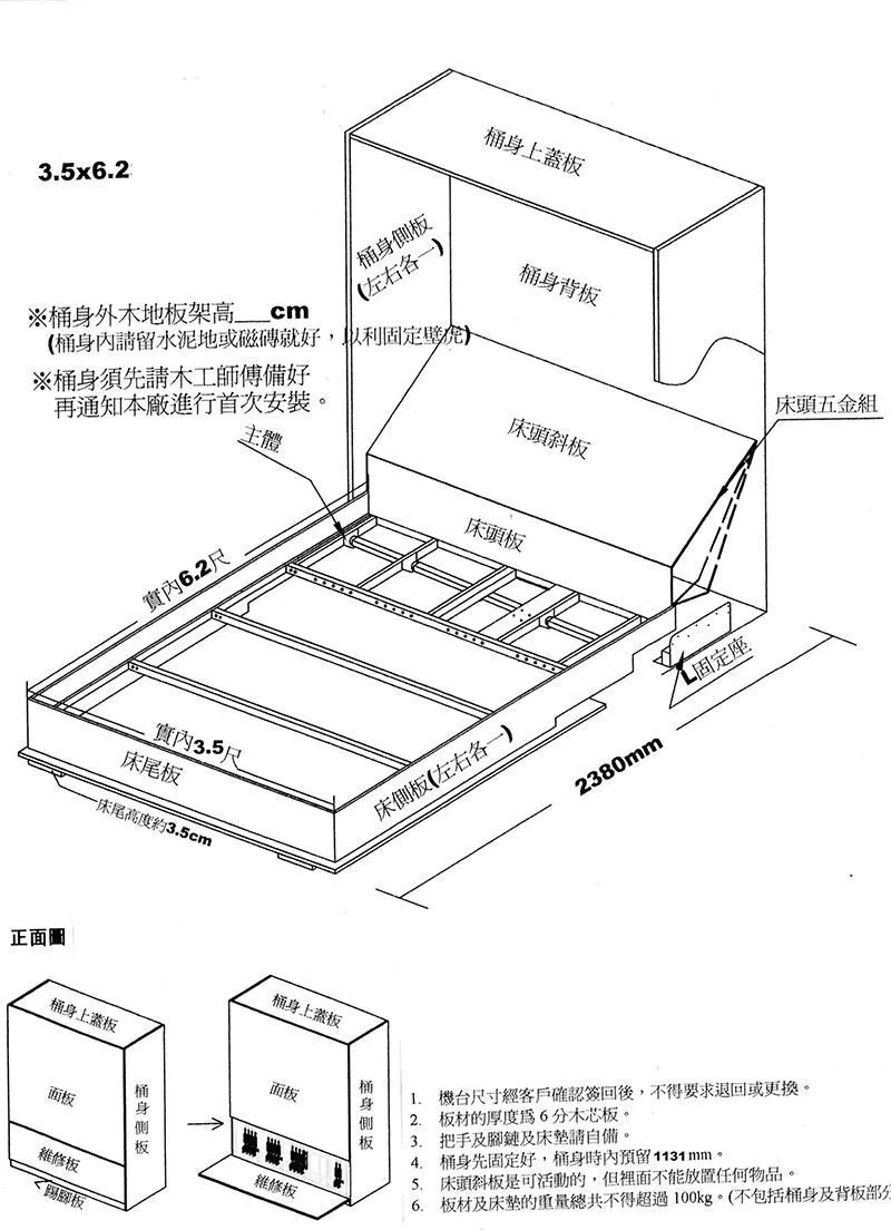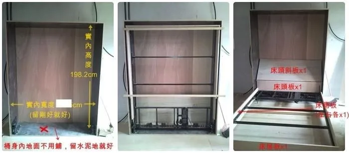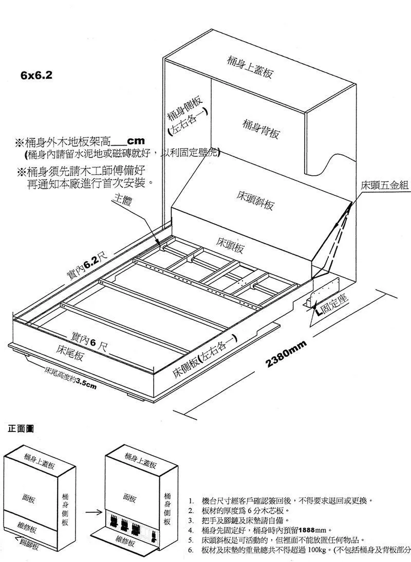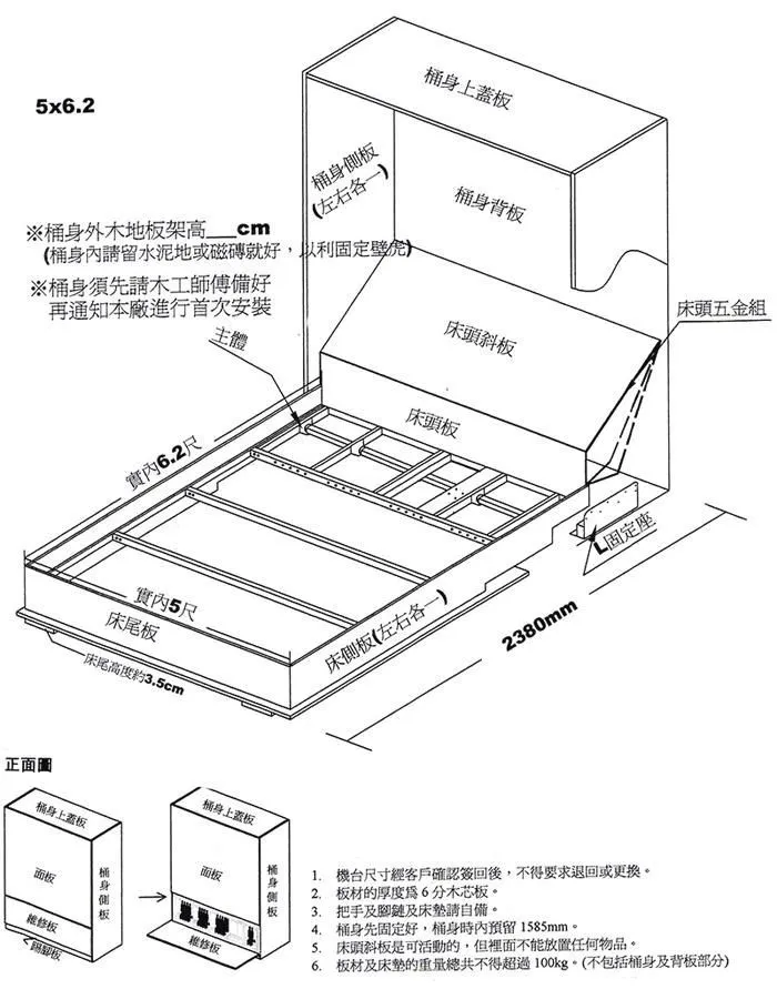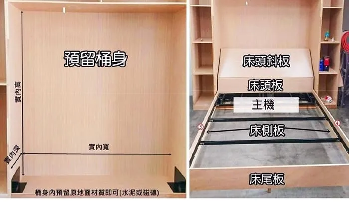 電動掀床五金,可分單人床或雙人床,面板可自行設計,此電動掀床五金可含施工 。活動床的施工,基本上只要將位置留好,桶身先請木工釘起來,其餘板材照圖上面的尺寸裁好即可,接下來本公司的工作人員會到現場施工,等我們第一次施工完,再做面板、噴漆,完工後,我們人員會第二次施工,依照板材以及彈簧床下去調整重量,之後即可正常使用了。