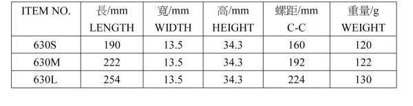 螺距:160mm (630S) / 192mm (630M) / 224mm (630L)尺寸:630S:長190 x寬13.5 x高34.3 mm630M:長222 x寬13.5 x高34.3 mm630L:長254 x寬13.5 x高34.3 mm