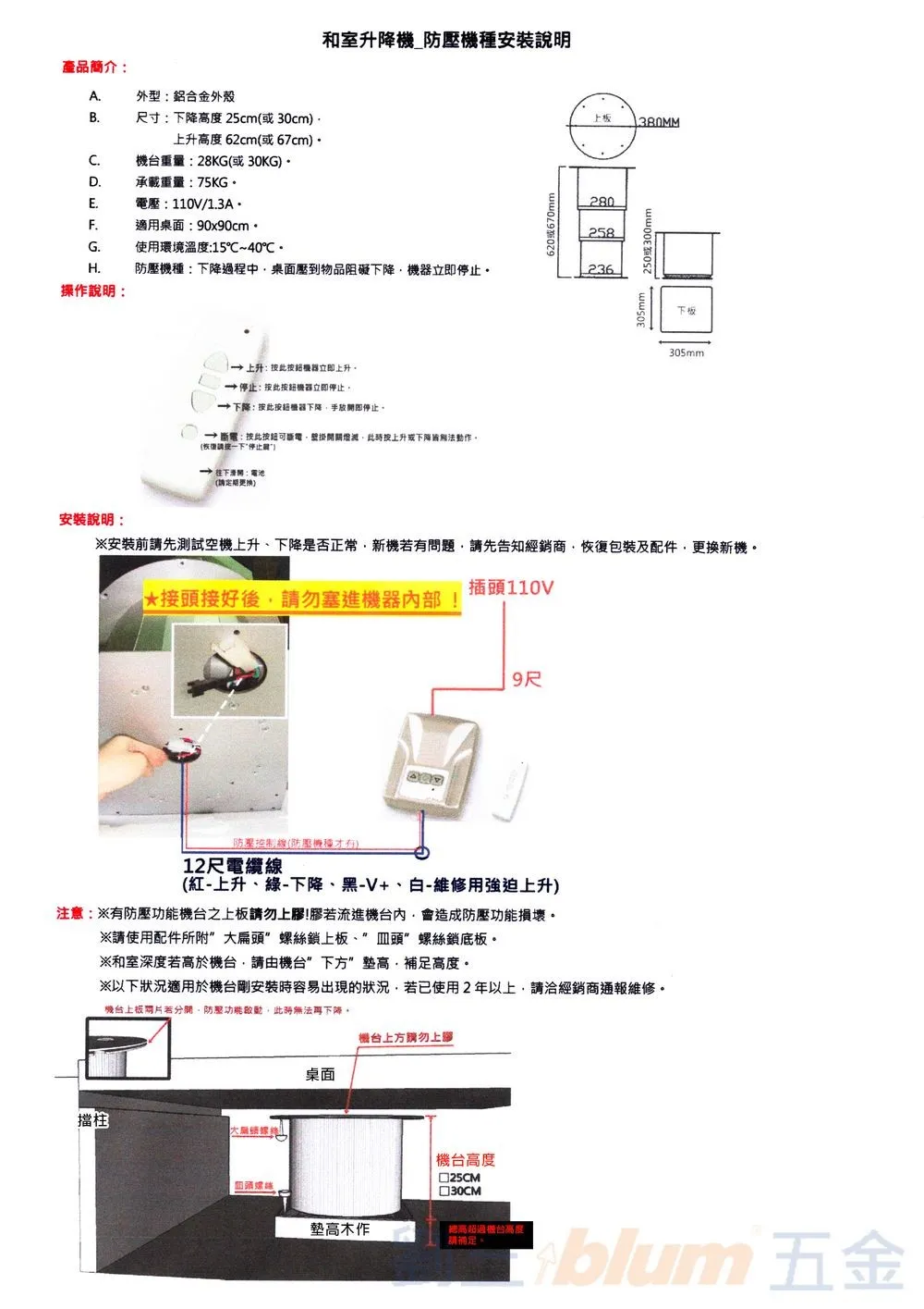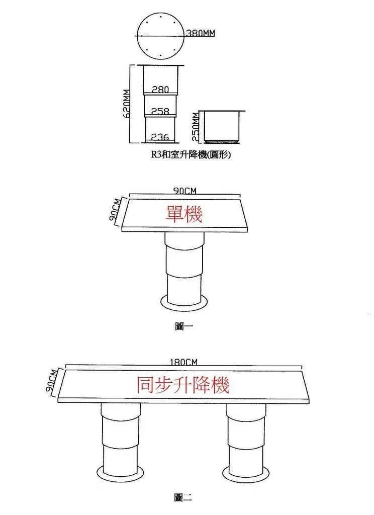 尺寸規格:(1)機器下降高度25-上昇高度62cm,(2)機器下降高度30-上昇高度67cm(3)另上升下降高度接受定製。
