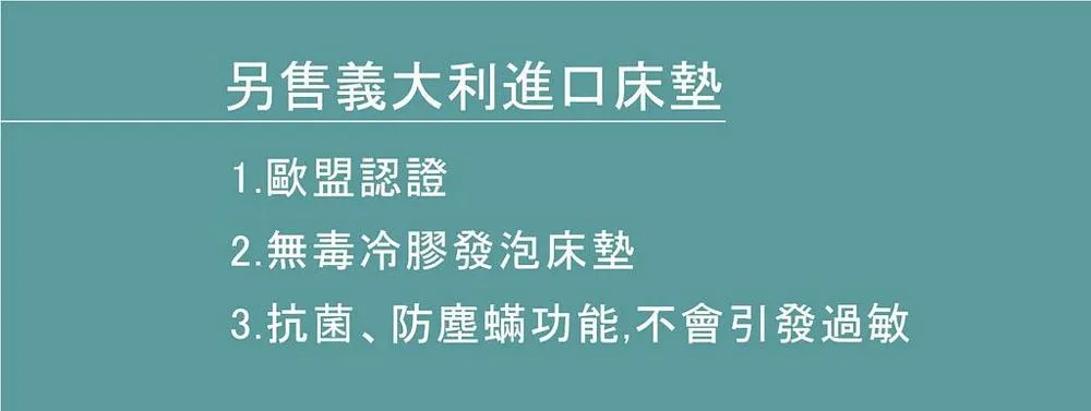 **另售義大利原裝進口冷膠發泡無毒床墊:具有防塵螨功能,通過歐盟檢測合格。另外床墊有貼心的拉鍊設計,床墊保護套可拆開清洗。床墊尺吋符合此單人掀床標準所需規格。
