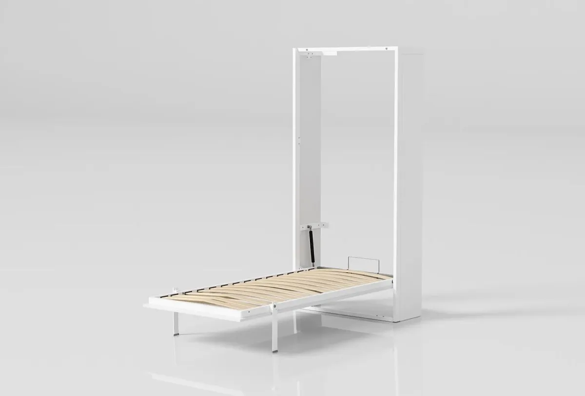 義大利原裝進口正掀單人床五金(含排骨床架及床腳),能垂直隱藏式收起於櫃體中,下降時,具有緩衝功能。掀床收起時,床腳能隱藏於櫃體中,掀床下降時,床腳具有自動定位功能。