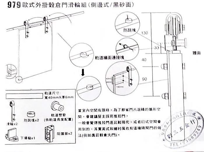 當室內空間有限時,為了節省門片迴轉的扇形空間,可採用推拉門。 最新的美式穀倉門設計可應用於雙扇或單扇門,安裝方式簡便,不需要固定整座外框。讓美式和鄉村風格也有新的隔間門之設計及做法。 產品規格有隱藏式及外掛式兩種,顏色有不鏽鋼及磨砂黑。軌道載重100-120kg (水泥牆/打壁虎),載重80kg(輕隔間或木牆用)。軌道長度不限,可依需求量身訂製。外掛式/不鏽鋼 外掛式/黑砂面 隱藏式/黑砂面