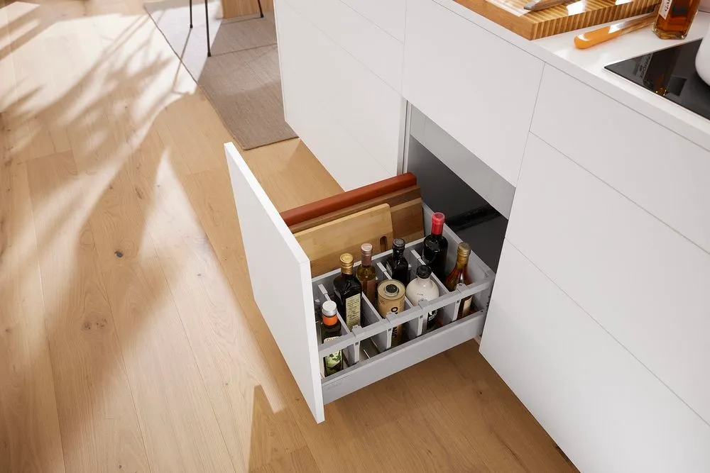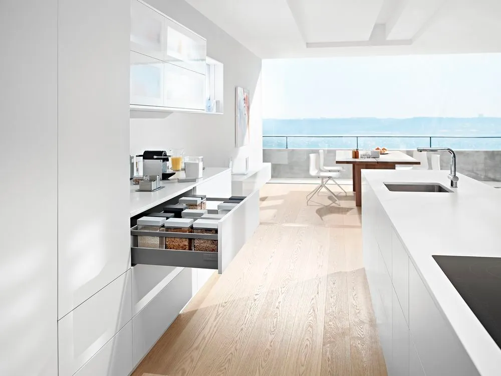 豪華金屬方桿抽屜的滑軌同樣是搭配BLUMOTION 緩衝阻尼,抽屜拉開時,滑順平穩,抽屜關閉時,輕柔緩衝安靜。使用壽命長,經過十萬次以上的開合耐用測試。不僅外型時尚美觀,更具實用性。