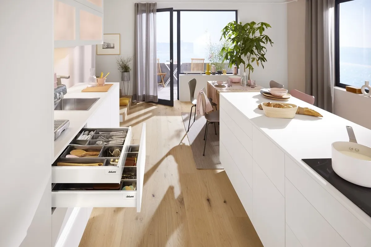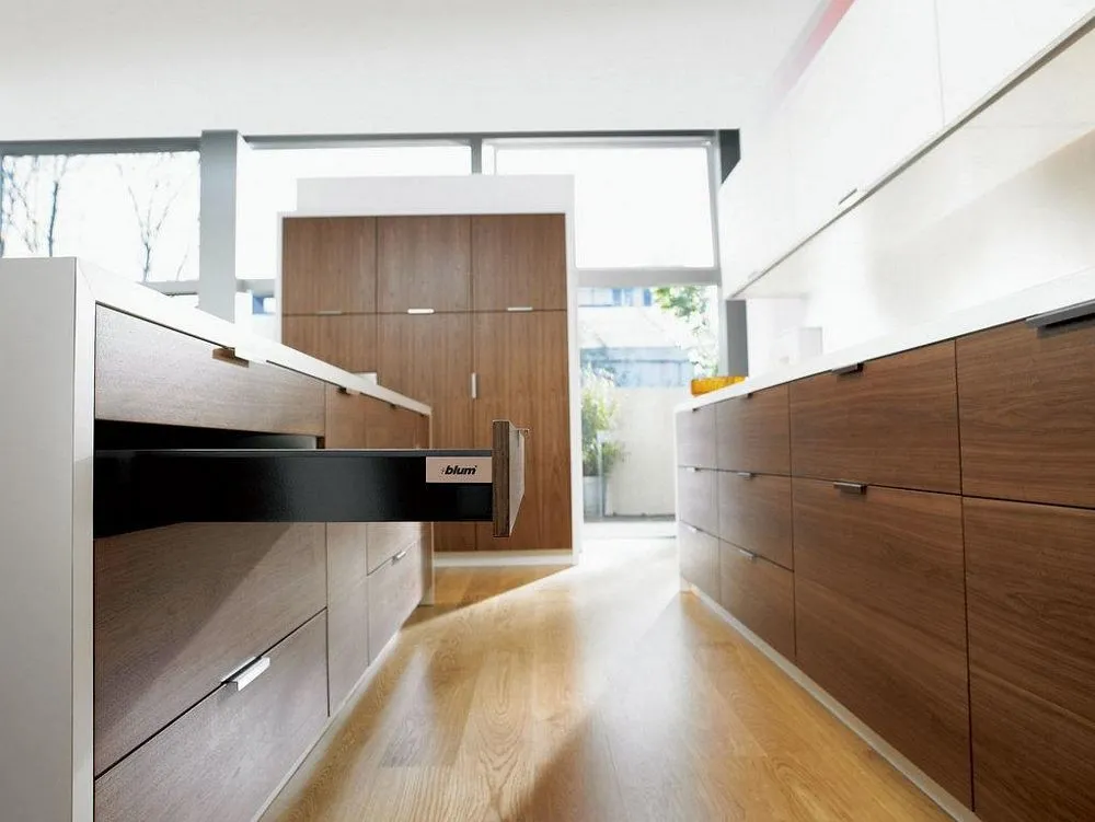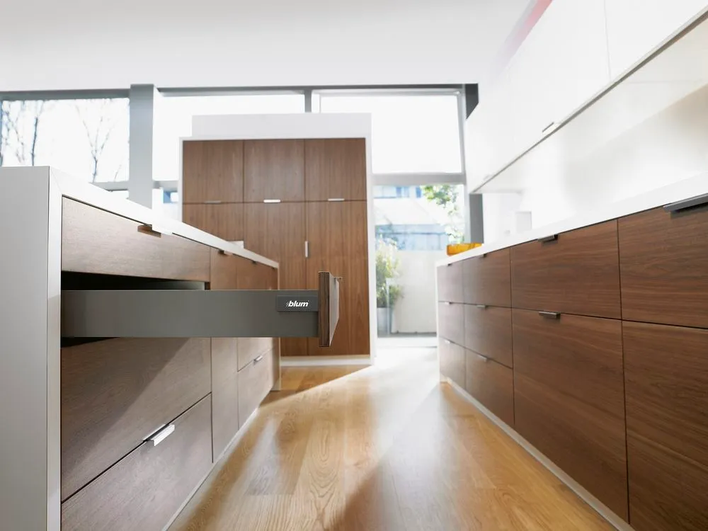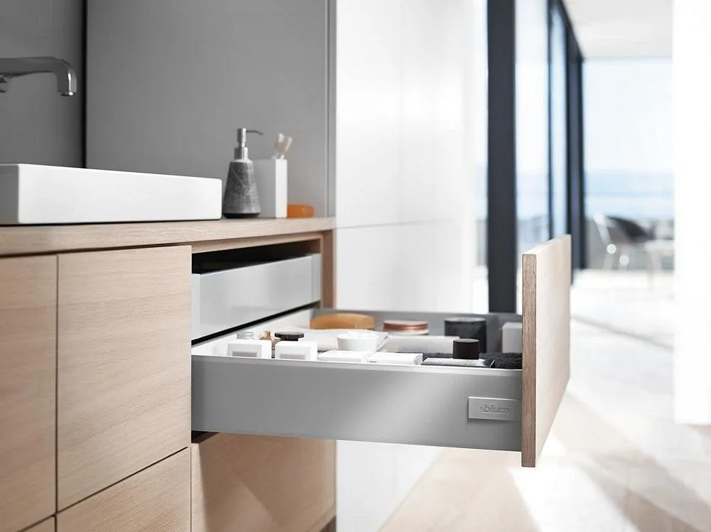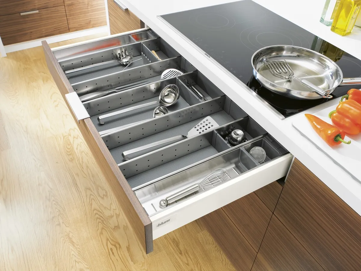 豪華金屬方桿抽屜的滑軌同樣是搭配BLUMOTION 緩衝阻尼,抽屜拉開時,滑順平穩,抽屜關閉時,輕柔緩衝安靜。使用壽命長,經過十萬次以上的開合耐用測試。不僅外型時尚美觀,更具實用性。
