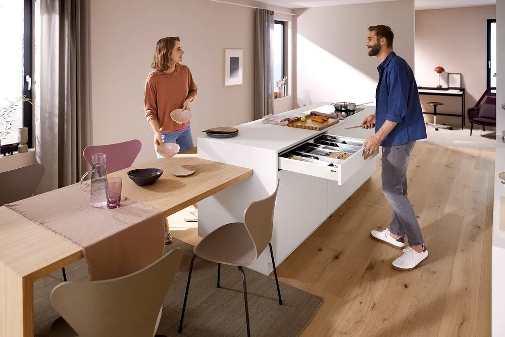 無論是搭配直桿還是加高側牆的抽屜,TANDEMBOX antaro 方桿金屬抽系列代表的是一種明朗、稜角分明的外觀風格。所有的零件在顏色上是互相匹配的,意在突出純粹的產品設計風格。