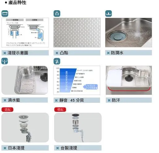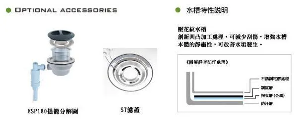 材質:不鏽鋼 SUS304# 0.8T外徑尺寸: 834×554x190mm內徑尺寸: 800x505x190mm表面處理: 壓花紋防震消音墊加工方式: 上裝、下坎、焊接特性:防澗水、防汗、靜音、淺提設計附屬配件: ESP180Φ環保大提籠防臭杯組(可另購日本進口淺提) 、ST半邊滴水籃、ST掛籃