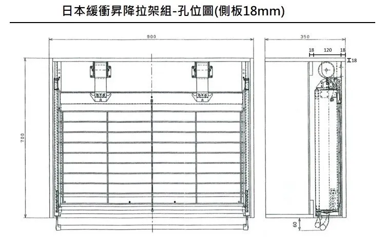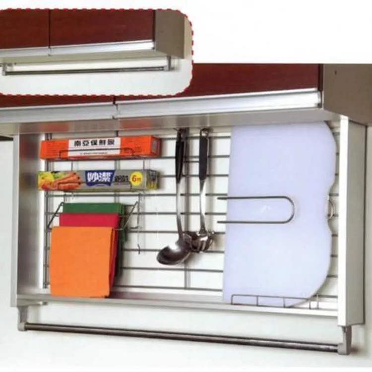 日本進口下拉壁掛架 (編號: 373-PD90),不用時,可收起。增加收納空間。適用於90公分的櫃體,附5種掛架(保鮮膜盒架、味料架、湯勺掛勾、抹布架及菜刀砧板架)。