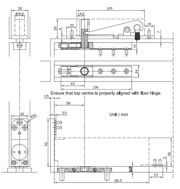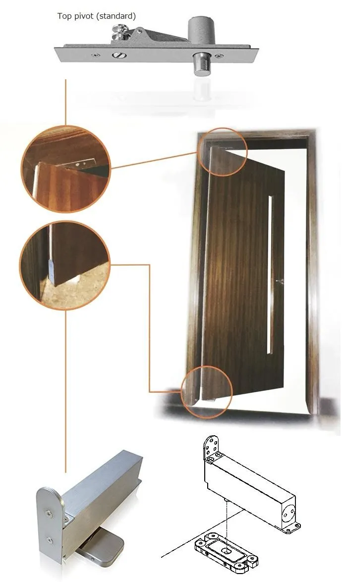 最大開啓角度為內外150度,另可選擇90度或無90度停位,10度以內有緩衝關門效果,輕巧設計,取得EN1154認證(耐久試驗:50萬次),次世代隱藏式閉門器,取代一般地鉸鍊。快速安裝:地面不須開槽,安全簡易。