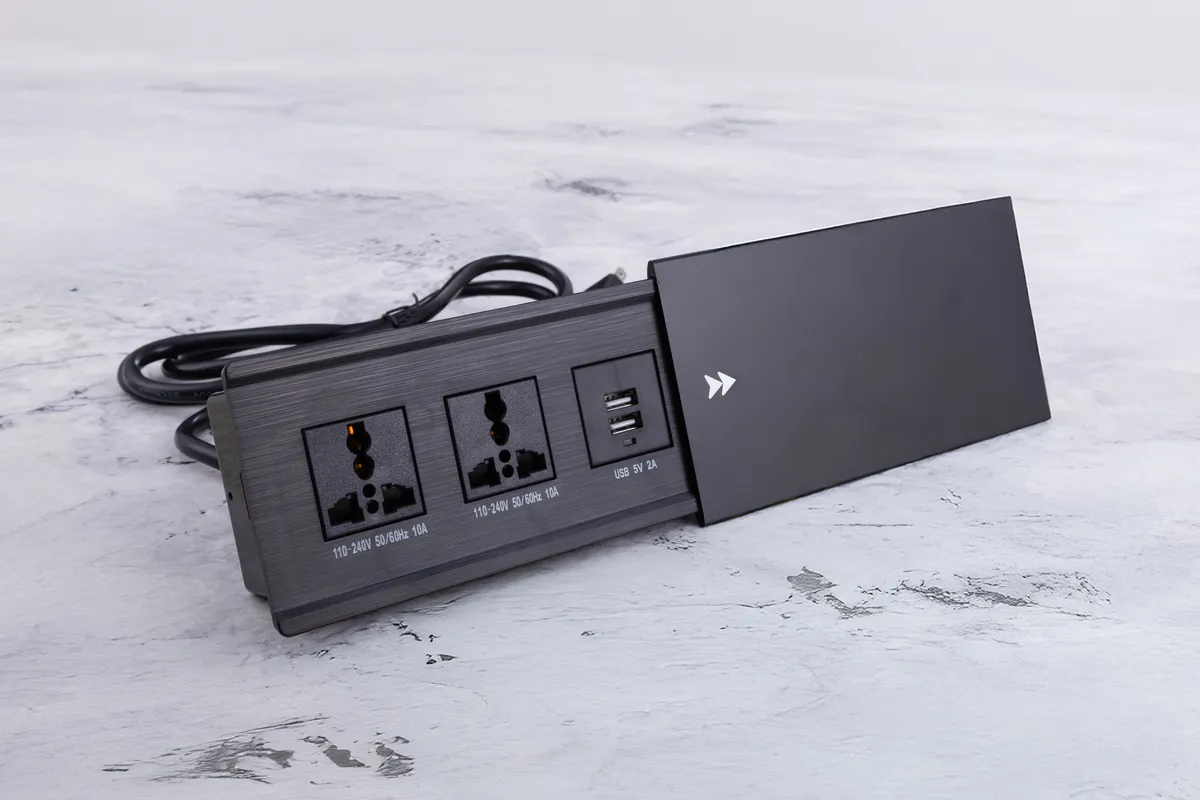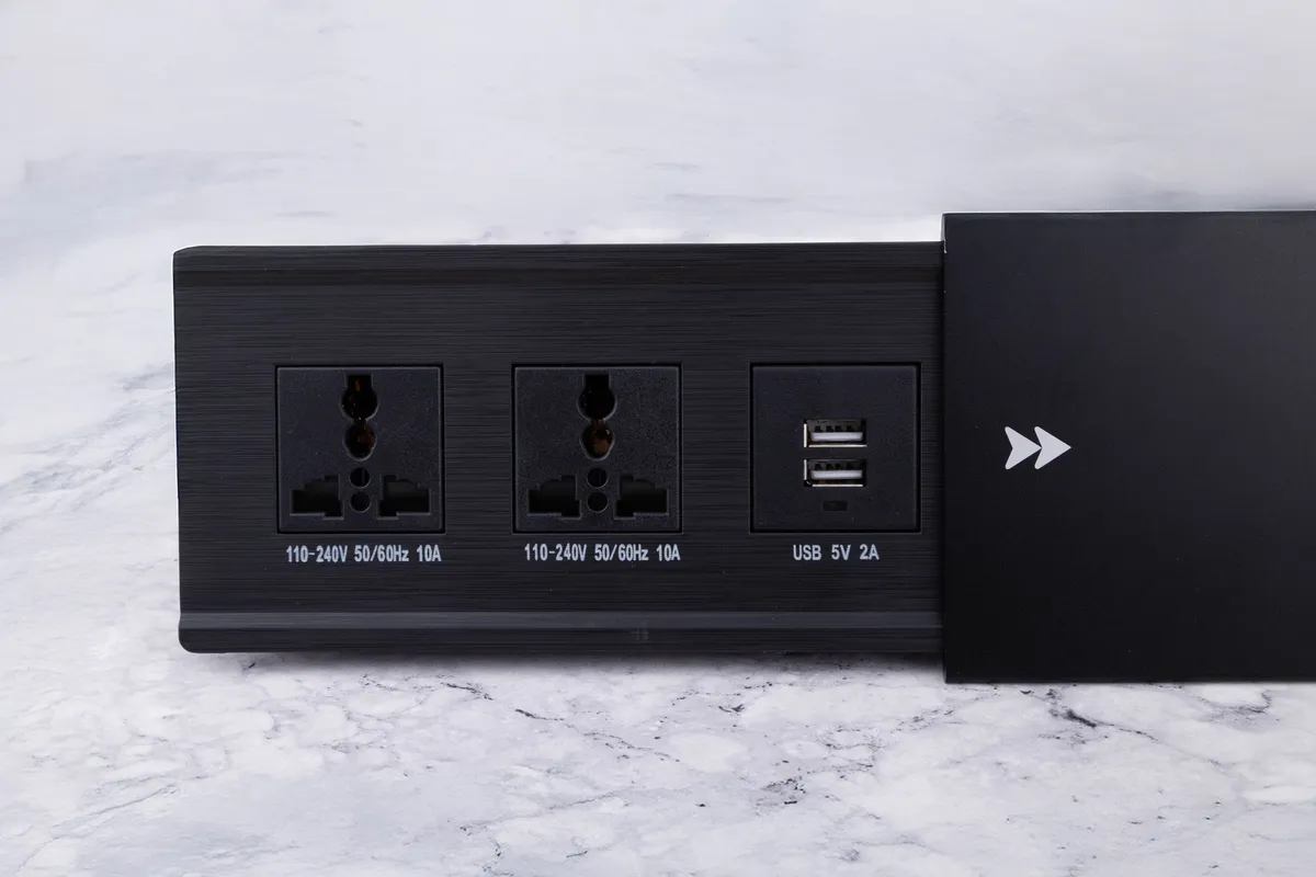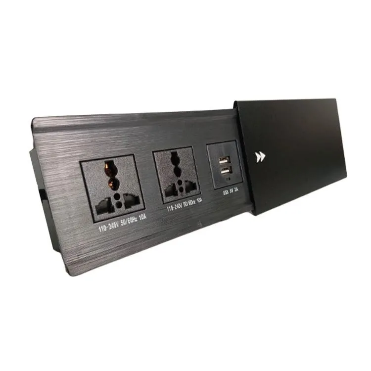 產品尺寸:190X100X39 mm開孔尺寸:約178X72 mm (建議顧客以實物開孔)電壓:110/220 V通用產品顏色:黑色外殼材質:鋁合金適用範圍:廚房、辦公室、書房等配置: 萬國插座*2、充電雙USB*1實品拍攝