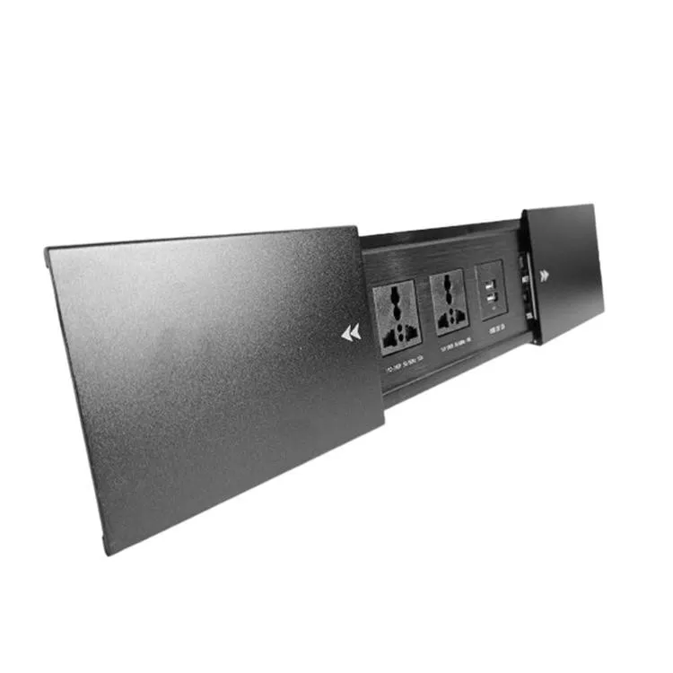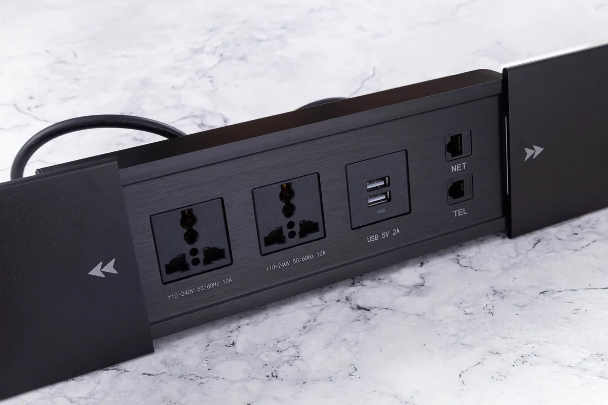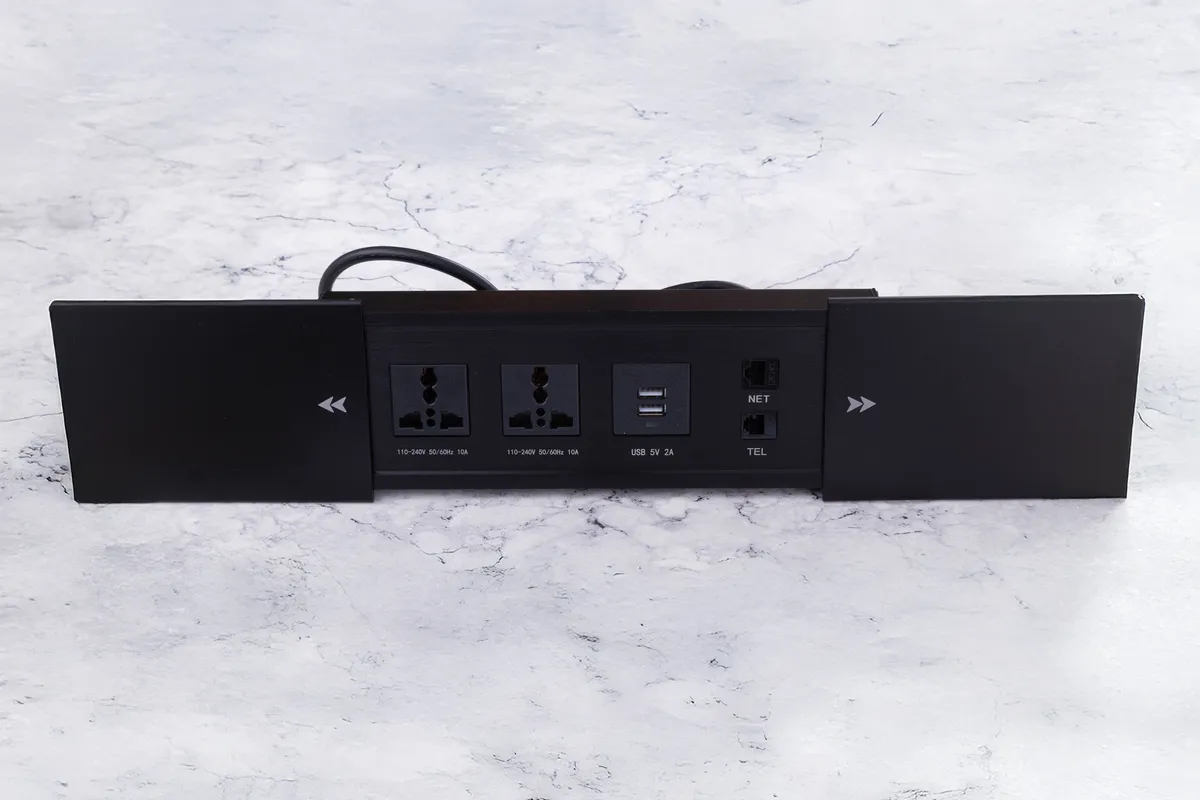 產品尺寸:236X100X39 mm開孔尺寸:224X72 mm (建議顧客以實物開孔)電壓:110/220 V通用產品顏色:黑色/銀色外殼材質:鋁合金適用範圍:廚房、辦公室、書房等配置: 萬國插座*2、充電雙USB*1、電話線*1、網路線*1 實品拍攝