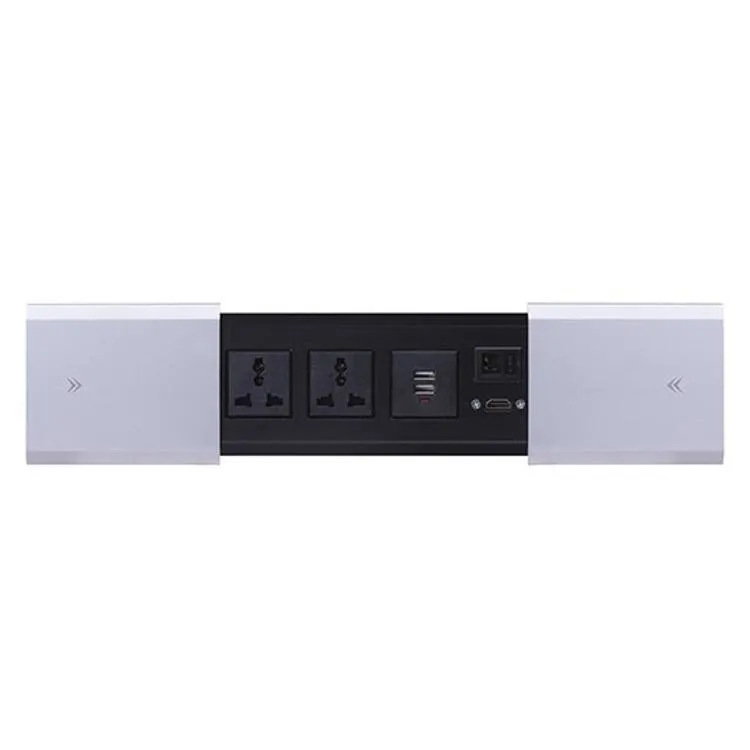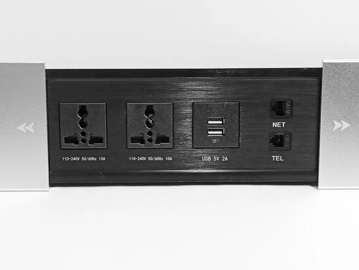 產品尺寸:236X100X39 mm開孔尺寸:224X72 mm (建議顧客以實物開孔)電壓:110/220 V通用產品顏色:黑色/銀色外殼材質:鋁合金適用範圍:廚房、辦公室、書房等配置: 萬國插座*2、充電雙USB*1、電話線*1、網路線*1實品拍攝