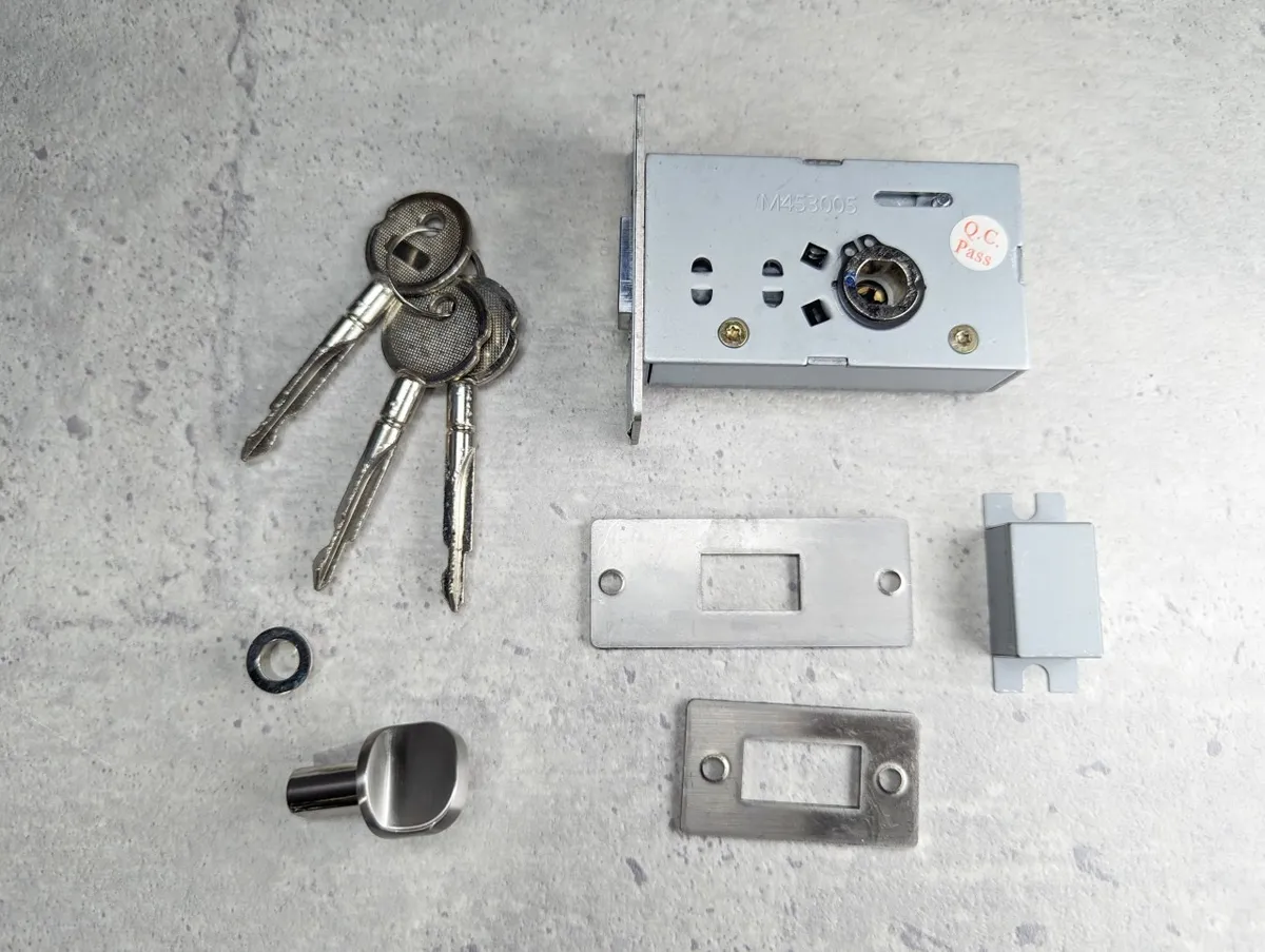 產品編號:408-1036-4Q/N-勾鎖 (一段式暗鎖) 鎖距: 52mm 面板: 28x70mm 鎖體: 83x46mm 門片適用厚度:- cm 附鑰匙三支與轉紐(黑銀/亮鉻)一個 實體拍攝 亮鉻 黑銀
