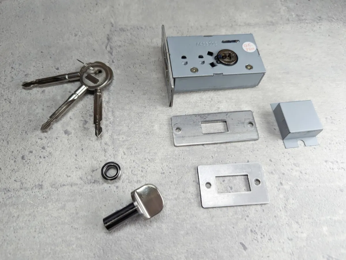 產品編號: 408-1036-4Q/N-勾鎖 (一段式暗鎖) 鎖距: 52mm 面板: 28x70mm 鎖體: 83x46mm 門片適用厚度:- cm 附鑰匙三支與圓形轉紐(黑銀/亮鉻)一個 實體拍攝 亮鉻 黑銀