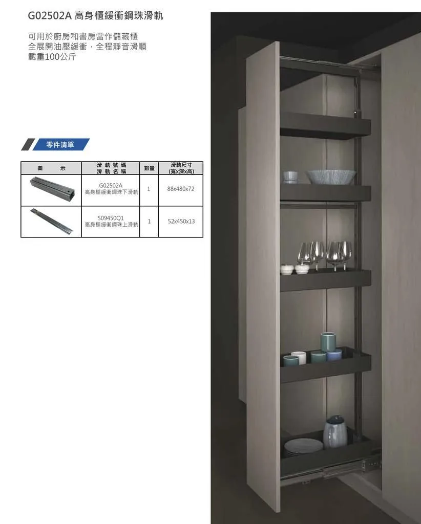 產品說明:可用於廚房和書房當作儲藏櫃,全展開油壓緩衝,全程靜音滑順,載重100kg。產品規格:高身櫃緩衝鋼珠下滑軌: 88W*480D*72H高身櫃緩衝鋼珠上滑軌: 52W*450D*13H 上滑軌 下滑軌