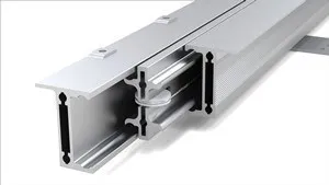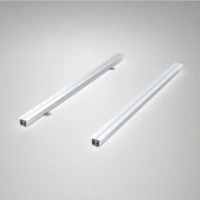 無框型中央對開鋁合金鋼珠滑軌五金,安裝簡易、桌體設計自由度高,高張力傳動繩索同步性佳,可配合各式伸縮桌設計需求。