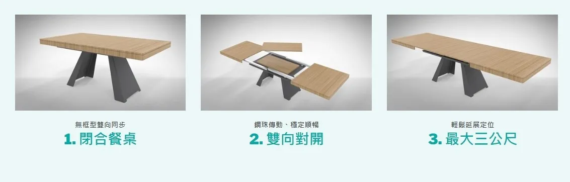 義大利研發、製造,耐重鋁合金餐桌滑軌,鋼珠傳動系統搭配PVC珠座,靜音耐用!義大利特殊陽極處理,表面光滑耐磨,全展開80kgs載重實木桌也輕鬆無負擔。