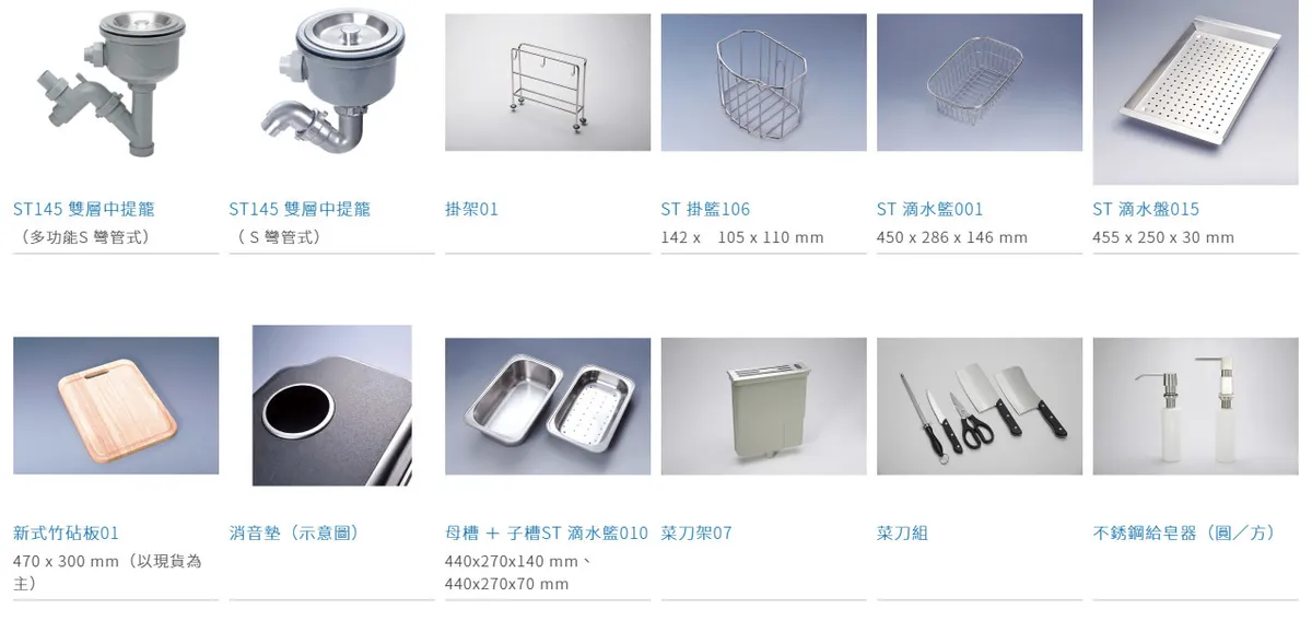可另購配件:ST 雙層大提籠(多功能S彎管式/S彎管式)、掛架、母槽+子槽ST滴水籃、ST滴水盤、ST掛籃、不鏽鋼給皂器、菜刀架、菜刀組、消音墊