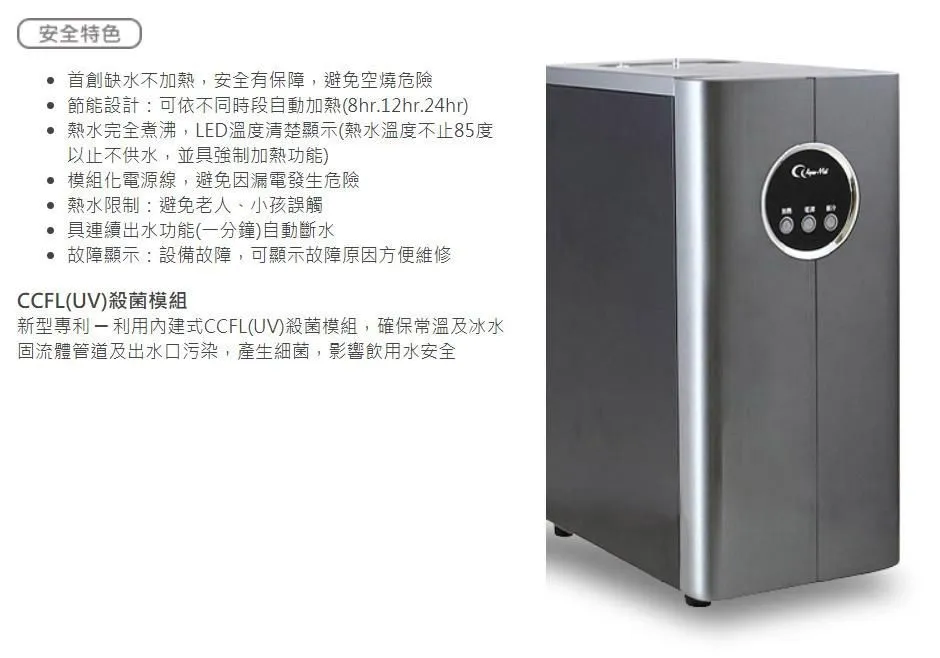 採用全球最新飲用水專利技術內建CCFL(UV)紫外線殺菌模組,確保溫水及冰水達到無菌效果,避免出水口及淨水管道二次汙染。