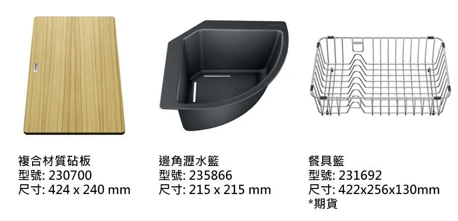 產品型號: 435-523043 德國進口花崗岩水槽-黑色產品尺寸: 700x 510 mm水槽深度: 220 mm水槽顏色: 黑色、灰色、白色安裝方式: 上嵌選配: 砧板、邊角瀝水籃、餐具籃(期貨) 選購配件