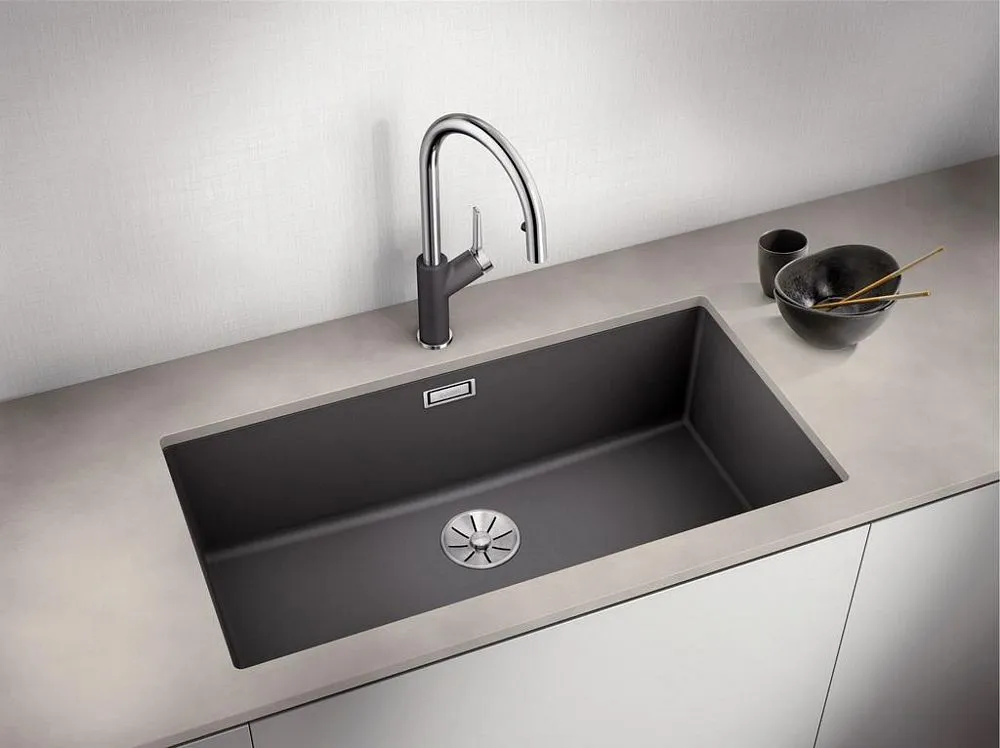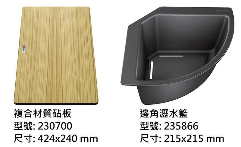 產品型號: 435-523141 德國進口花崗岩水槽-黑色產品尺寸: 830x460 mm水槽深度: 220 mm水槽顏色: 黑色、灰色、白色安裝方式: 下嵌標準配備: 不鏽鋼滴水槽、落水頭修飾蓋選配: 砧板、邊角瀝水籃