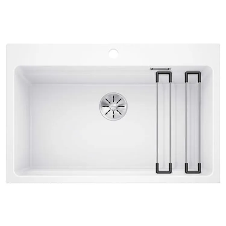 產品型號: 435-525191 德國進口花崗岩水槽-白色產品尺寸: 780x 510 mm水槽深度: 220 mm水槽顏色: 黑色、灰色、白色、混泥土風格安裝方式: 上嵌標準配件: 不鏽鋼滑軌選配: 砧板※此產品為期貨 應用範例 標準配件