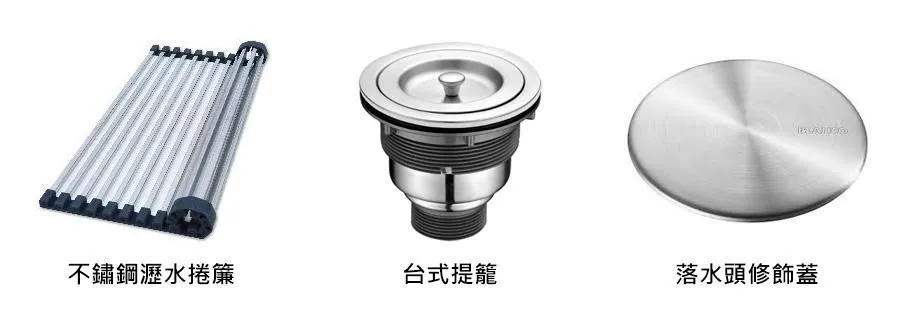 標準配件: 不鏽鋼瀝水捲簾、台式提籠、落水頭修飾蓋