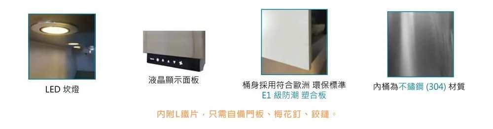 桶身採用符合歐洲環保標準E1級防潮塑合板,內桶為不鏽鋼(304)材質。