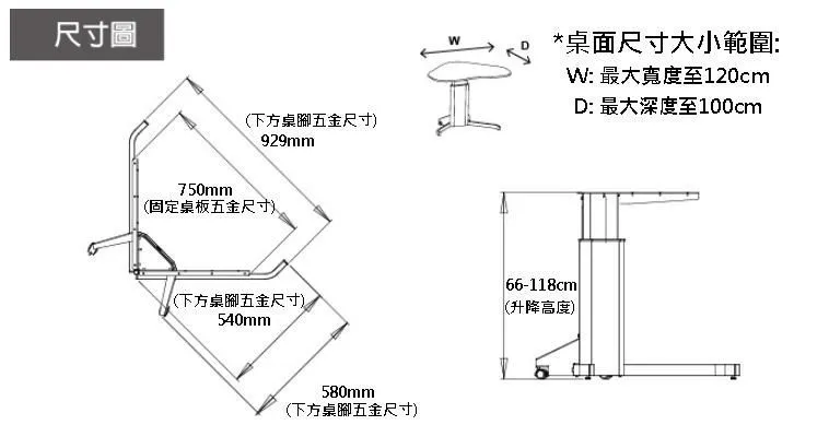 適用桌板: 寬93-120cm x 深58-100cm。