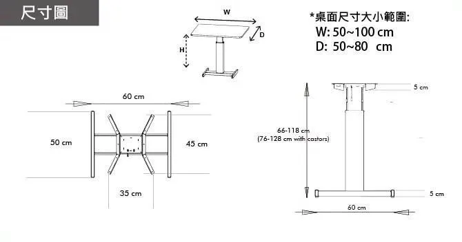 P.S. 此升降桌五金產品不含桌板,可另購,請參考標準桌板(小桌板118*80*2.5cm)。