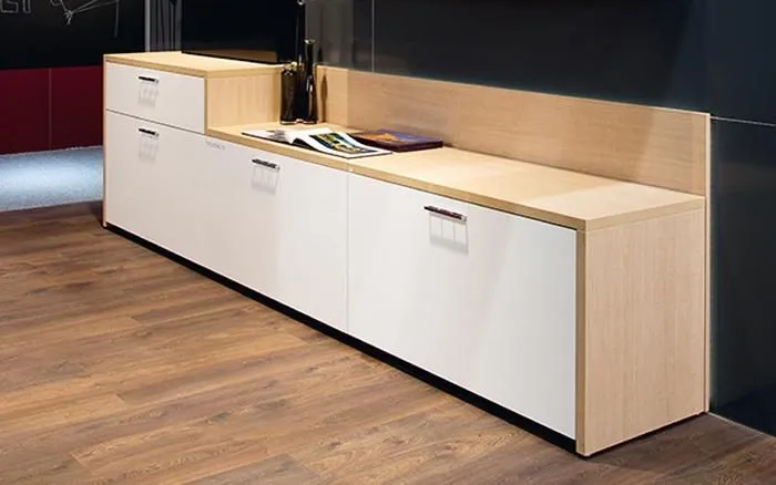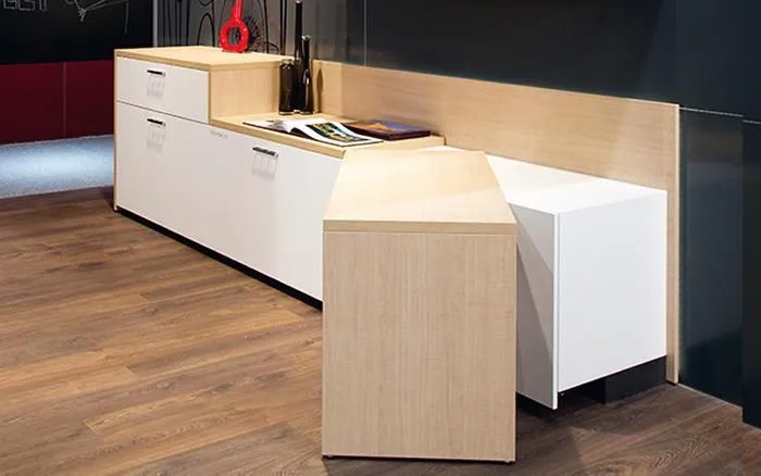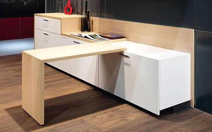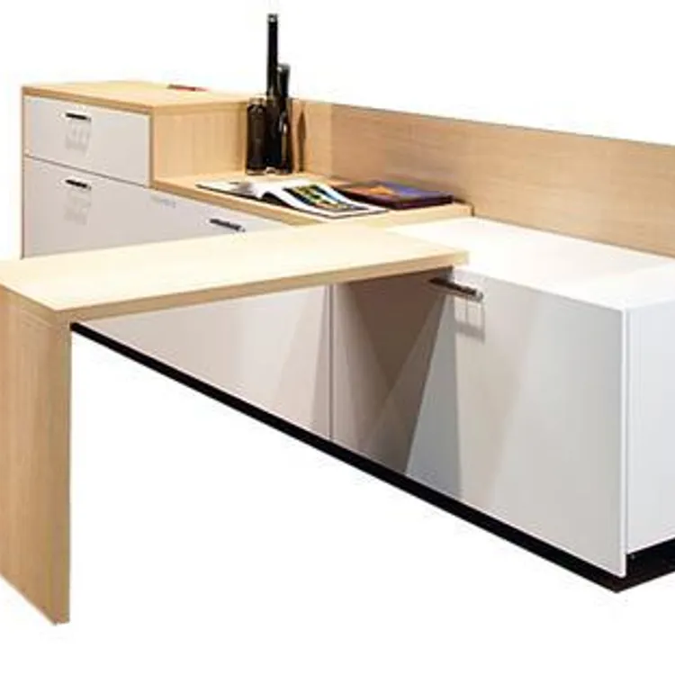 歐洲進口滑動式L型伸展桌 適用於空間狹小的小型房間,如工作間,手術候診室,會議室,兒童房或餐廳 這套配件允許一件家具有兩個功能; 餐具櫃和桌子 可以使用機櫃內的整個存儲空間 適用尺寸:桌板長度120公分以內 | 深度60公分以內 | 厚度2.5以內 | 側板厚度稍厚於下轉輪大小 操作影片: