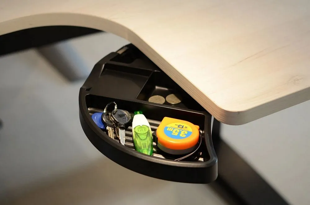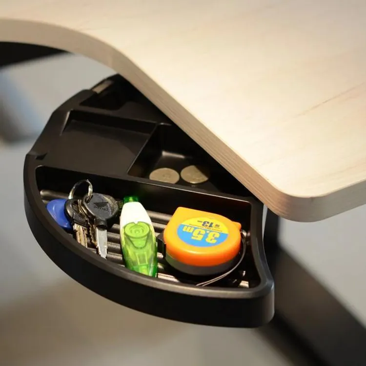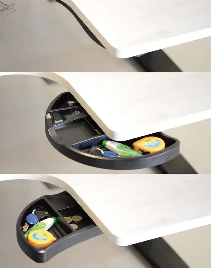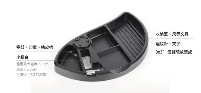 產品規格:可旋出使用並旋入收納在桌板下(360度旋轉),方便收納文具小物尺寸: 359 x 217 mm 高 32mm功能特色:1. 收納筆、尺等文具2. 可放置 3 x 3 cm 便利貼3. 附小型膠台,外直徑<5.6 cm 內直徑 >2.3 cm 最大膠帶寬度 2.1 cm4. 收納其他文具,如橡皮擦、迴紋針、夾子等*圖片僅供參考,請以實際物品為準。