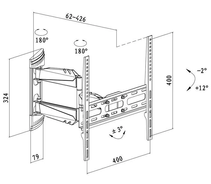 產品說明: 符合VESA規格 20x20cm、40×40cm。 適用32"~50" LCD。 可左右旋轉180°,俯仰往上2°往下12°。 電視與牆面距離 6.2~42.6 cm 材質: SPCC高強度鋼版 承重: 25kg。 壁板尺寸:W7.9 x H32.4 cm。 ※本產品通過德國GS安全標準認證。 ※本公司產品通過ISO9001品質認證。