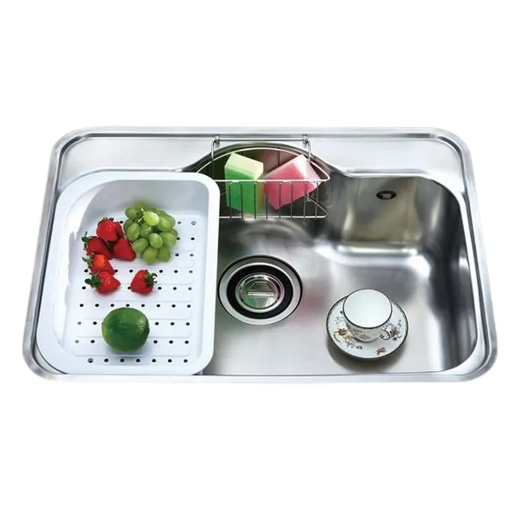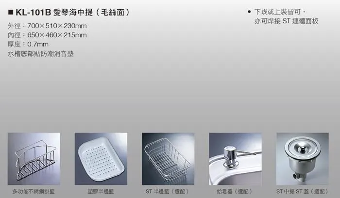 產品型號: CL-KL-0101B材質:不鏽鋼 SUS304#x0.7T外徑尺寸: 700×510×230mm內徑尺寸: 650x460x215mm適用櫃體: W700mm表面處理: 珍珠啞銀色 (水槽底部貼防潮消音墊)附屬配件: 不鏽鋼掛籃、 塑膠半邊籃、塑膠中提