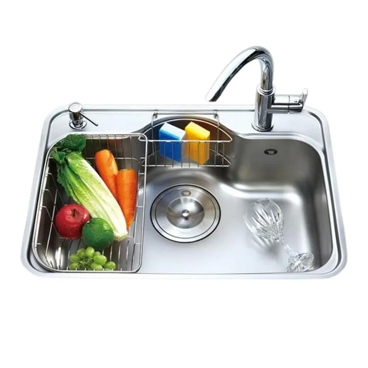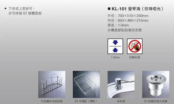 材質:不鏽鋼 SUS304#x1.0T外徑尺寸: 700×510×230mm內徑尺寸: 650x460x215mm適用櫃體: W700mm表面處理: 珍珠啞光(水槽底部貼防潮消音墊)加工方式: 上裝 下崁 焊接附屬配件: 多功能不鏽鋼掛籃、塑膠半邊籃、給皂器、防蟑防臭大提籠可加購配件: 不鏽鋼半邊籃