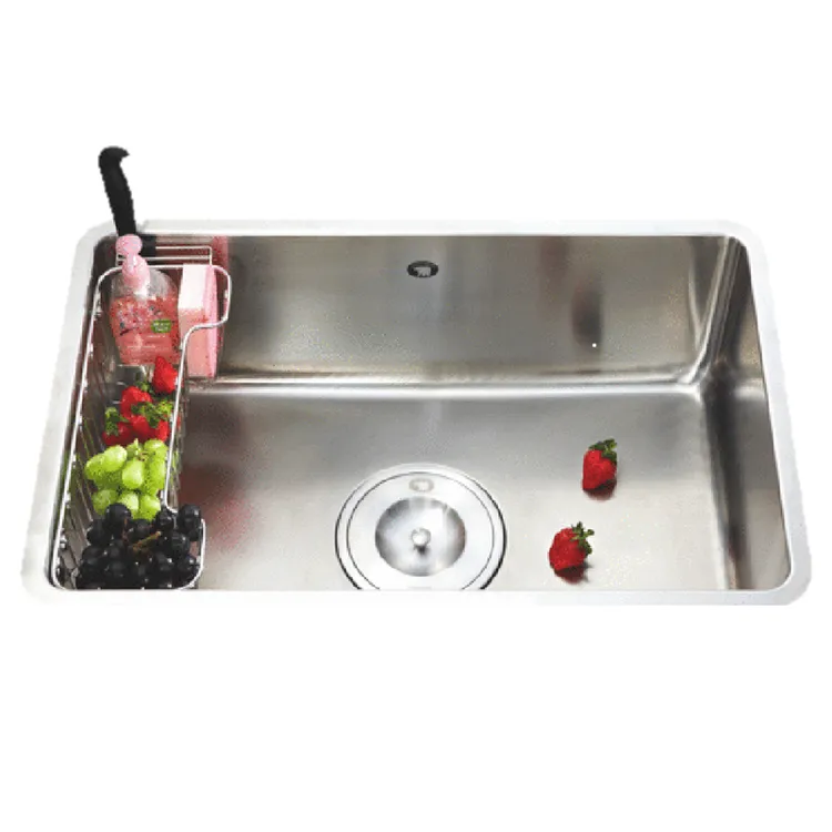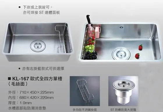 材質:不鏽鋼 SUS304#x1.0T外徑尺寸: 710×450×225mm內徑尺寸: 680×420×220mm適用櫃體: W700mm表面處理: 珍珠啞光(水槽底部貼防潮消音墊)加工 方式: 上裝 下崁 焊接附屬配件: 多功能不鏽鋼掛籃、塑膠半邊籃、給皂器、防蟑防臭大提籠可加購配件: 不鏽鋼半邊籃 應用範例: