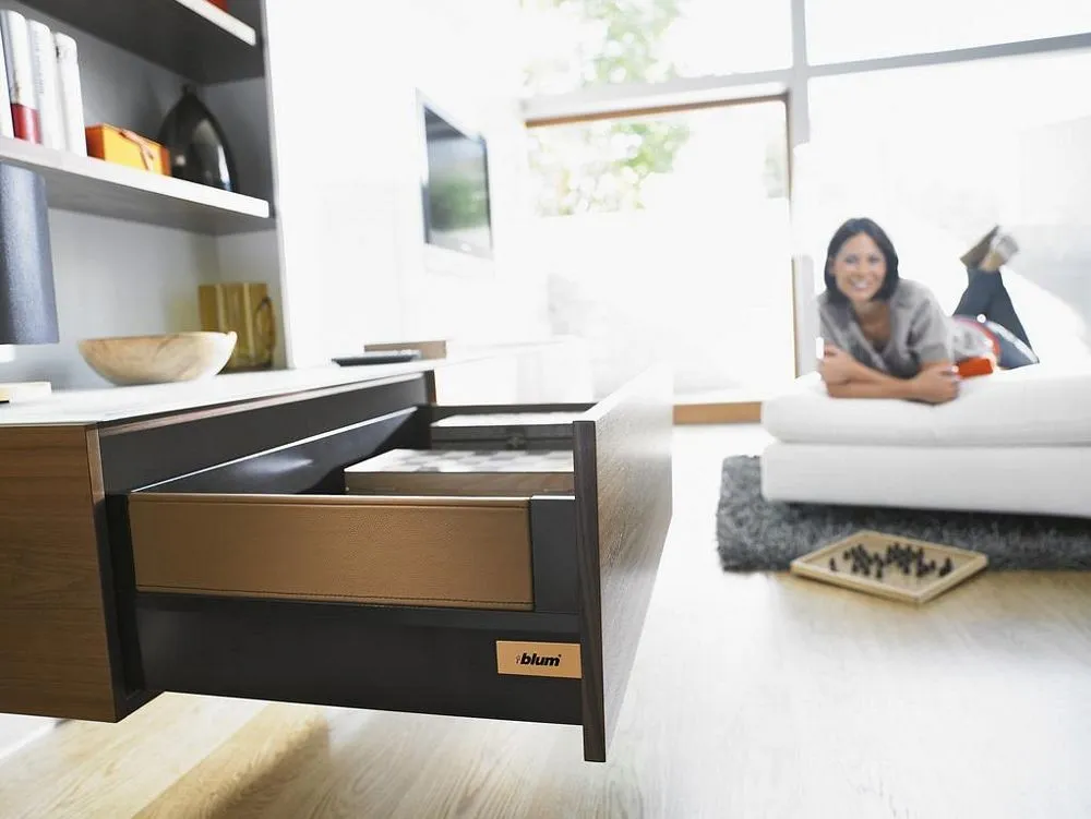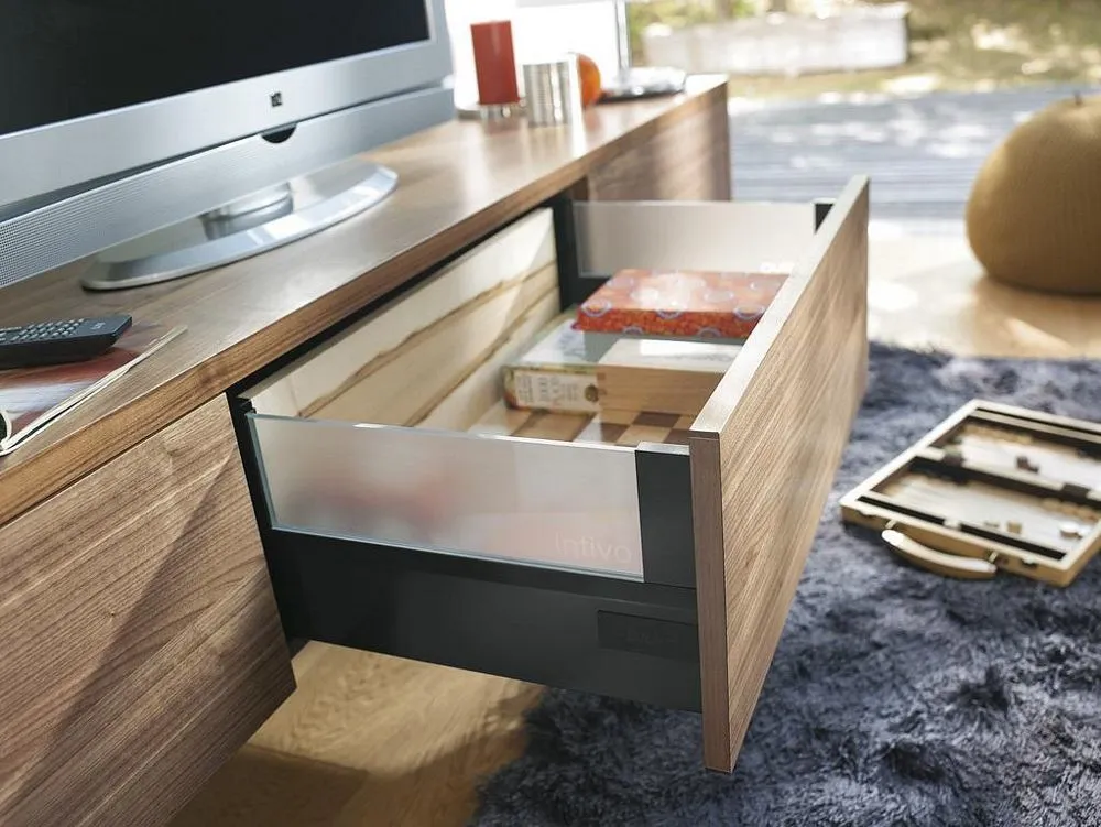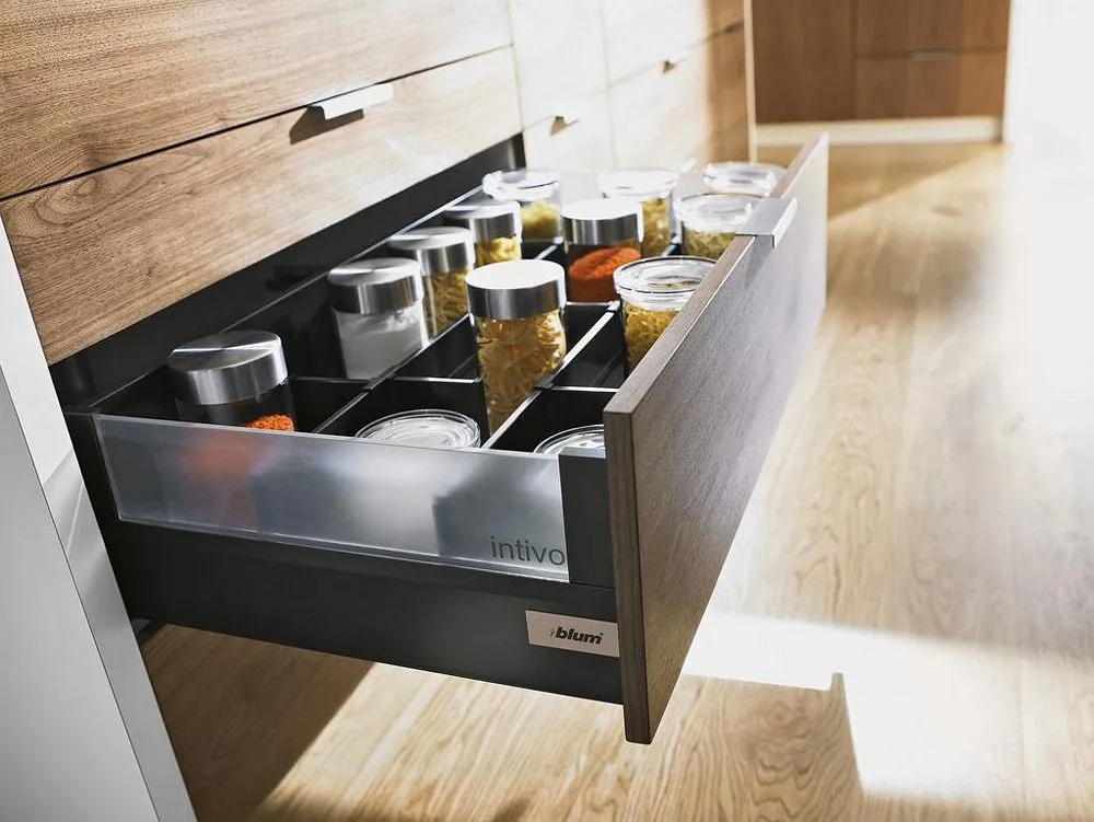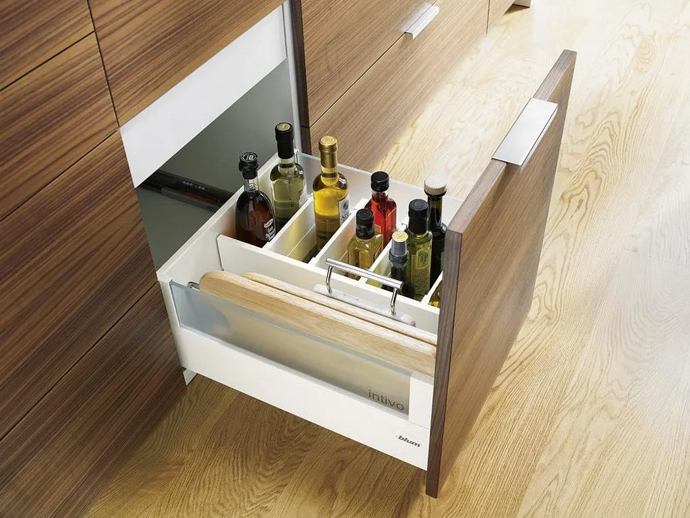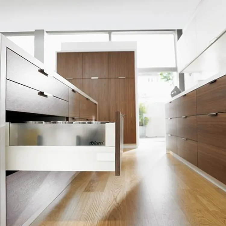 blum Intivo 帝寶金屬抽-高高玻璃側牆: 為了滿足個性化的設計需求,TANDEMBOX Intivo 帝寶金屬抽屜研發出了百變多樣化的側牆產品顏色,如珍珠絲光白、霧面黑、不鏽鋼,甚至於皮革或玻璃側牆。且不同顏色的抽屜側牆、零件、配件都在顏色和材料上相互一致。因此能打造出時尚多變且相互協調的整體效果。另外TANDEMBOX豪華金屬抽屜滑軌,經過數百萬次的實踐證明,能平穩順暢滑行的性能讓廣大客戶為之驚嘆。BLUMOTION 緩衝阻尼則打造出輕柔的關閉效果。
