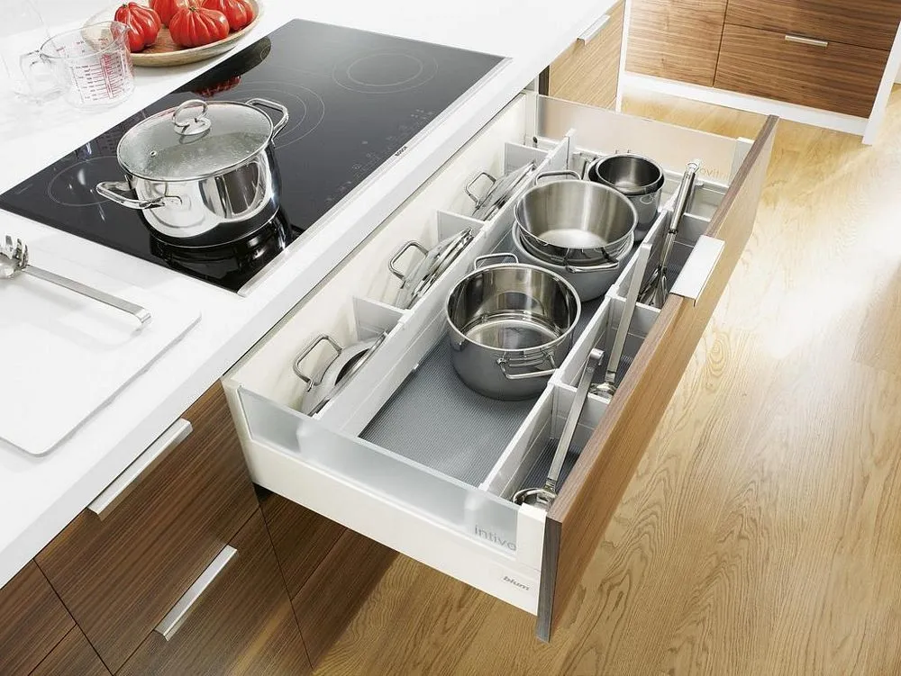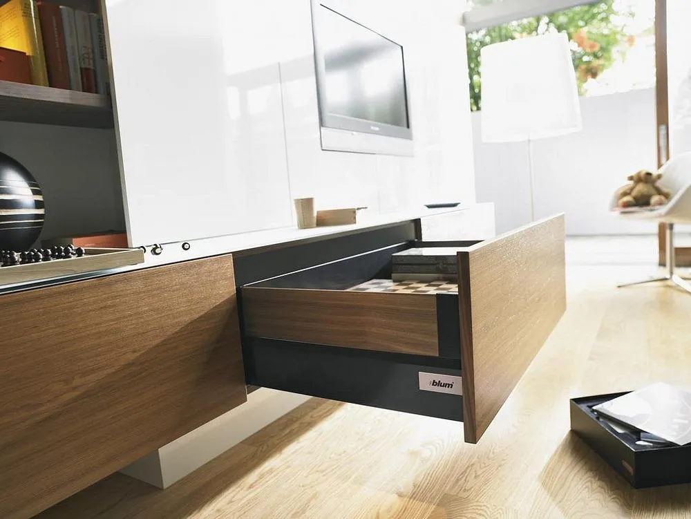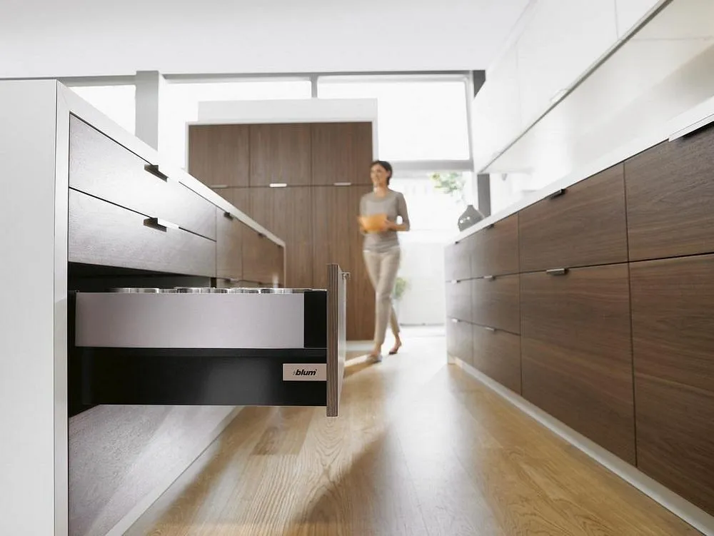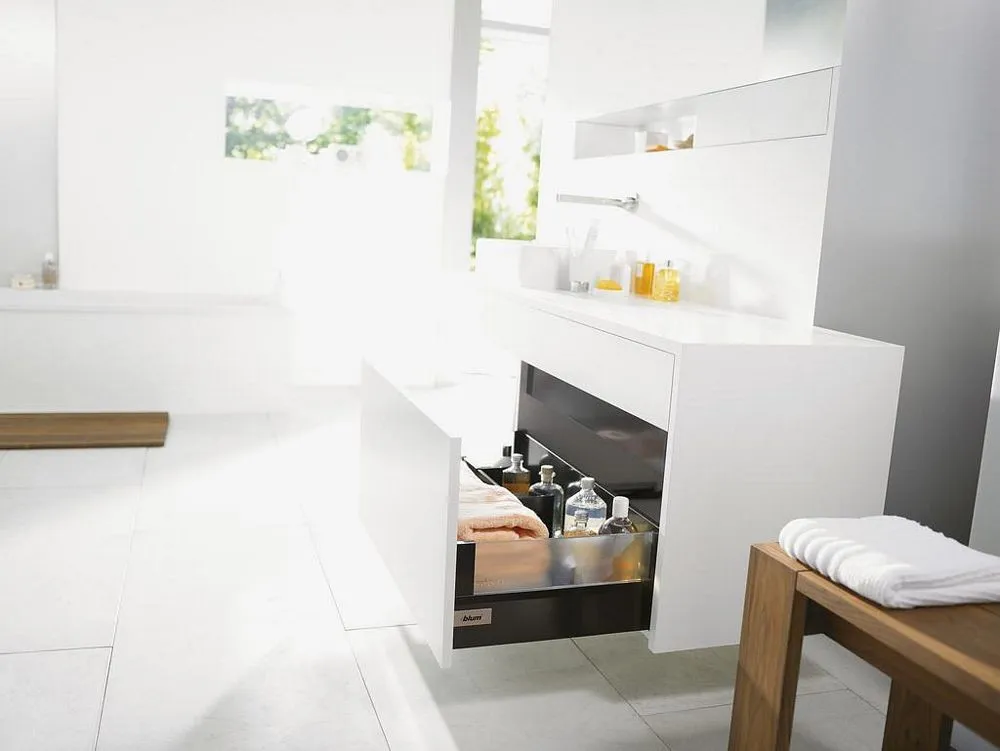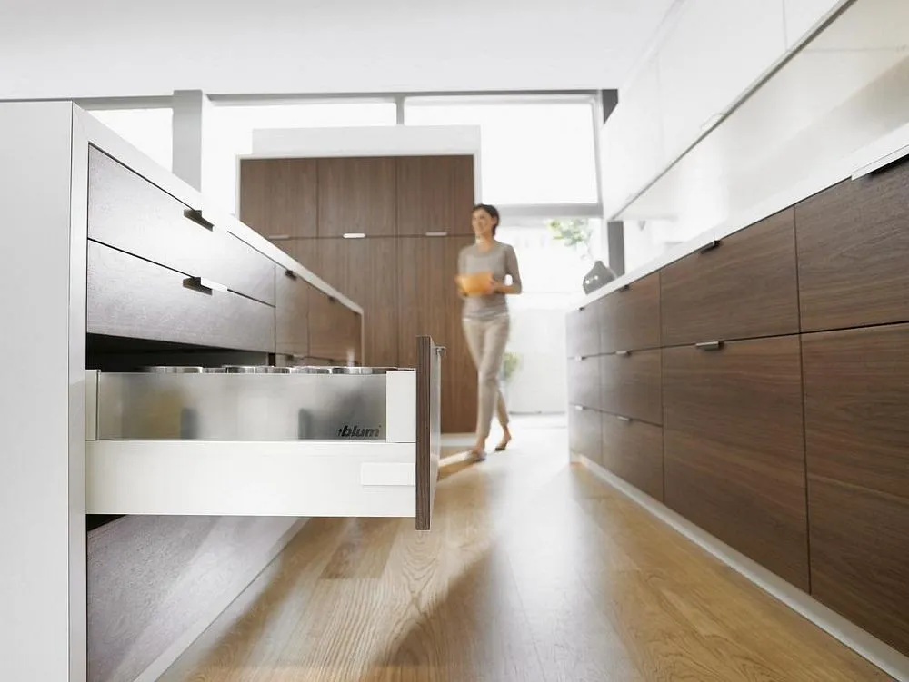 blum Intivo 帝寶金屬抽-高高玻璃側牆: 為了滿足個性化的設計需求,TANDEMBOX Intivo 帝寶金屬抽屜研發出了百變多樣化的側牆產品顏色,如珍珠絲光白、霧面黑、不鏽鋼,甚至於皮革或玻璃側牆。且不同顏色的抽屜側牆、零件、配件都在顏色和材料上相互一致。因此能打造出時尚多變且相互協調的整體效果。另外TANDEMBOX豪華金屬抽屜滑軌,經過數百萬次的實踐證明,能平穩順暢滑行的性能讓廣大客戶為之驚嘆。BLUMOTION 緩衝阻尼則打造出輕柔的關閉效果。