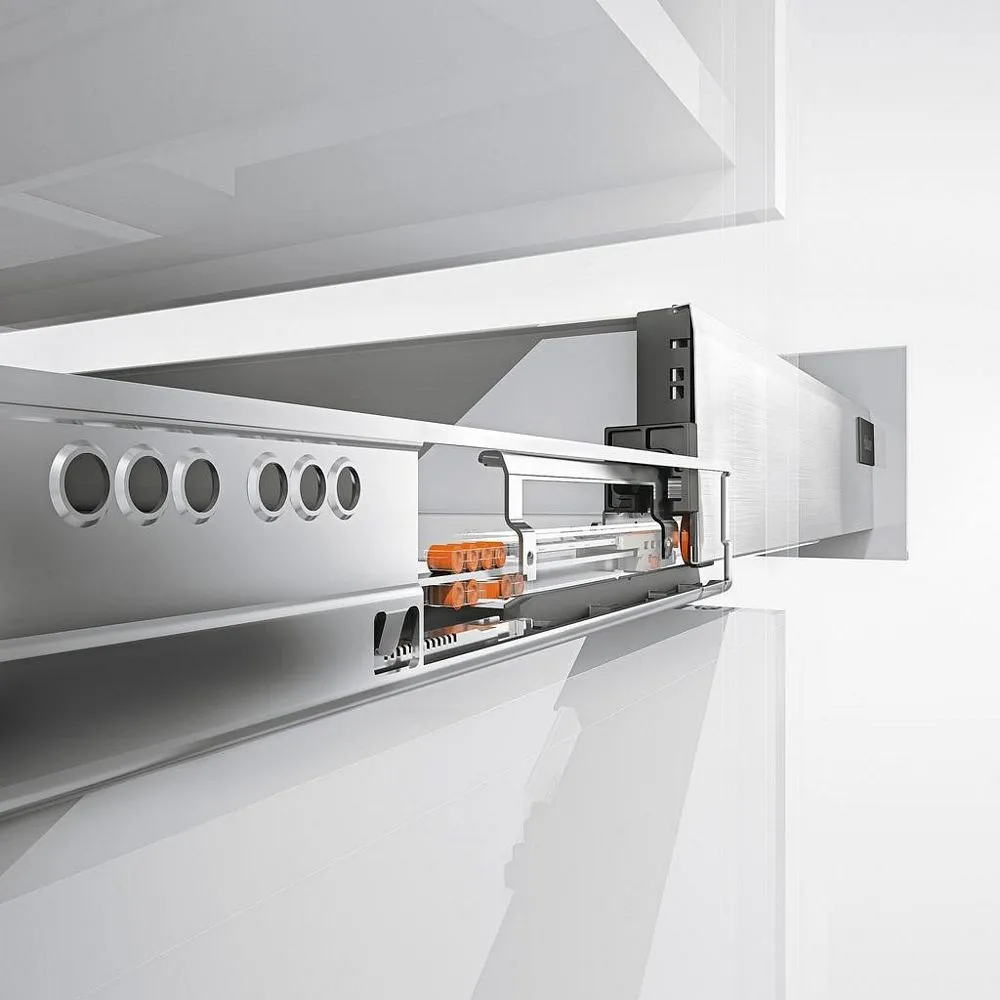 為了滿足個性化的設計需求,TANDEMBOX Intivo 帝寶金屬抽屜研發出了百變多樣化的側牆產品顏色,如珍珠絲光白、霧面黑、不鏽鋼,甚至於皮革或玻璃側牆。且不同顏色的抽屜側牆、零件、配件都在顏色和材料上相互一致。因此能打造出時尚多變且相互協調的整體效果。另外TANDEMBOX豪華金屬抽屜滑軌,經過數百萬次的實踐證明,能平穩順暢滑行的性能讓廣大客戶為之驚嘆。BLUMOTION 緩衝阻尼則打造出輕柔的關閉效果。