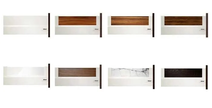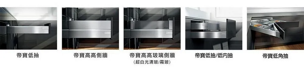 為了滿足個性化的設計需求,TANDEMBOX Intivo 帝寶金屬抽屜研發出了百變多樣化的側牆產品顏色,如珍珠絲光白、霧面黑、不鏽鋼,甚至於皮革或玻璃側牆。且不同顏色的抽屜側牆、零件、配件都在顏色和材料上相互一致。因此能打造出時尚多變且相互協調的整體效果。另外TANDEMBOX豪華金屬抽屜滑軌,經過數百萬次的實踐證明,能平穩順暢滑行的性能讓廣大客戶為之驚嘆。BLUMOTION 緩衝阻尼則打造出輕柔的關閉效果。