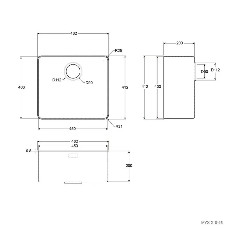-安裝尺寸:W462 x D412 mm (R31/平接) / W450 x D400 mm (R25/下嵌)