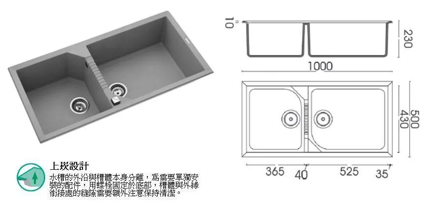 上崁設計:水槽的外沿與槽體本身分離,為單獨安裝的配件,用螺栓固定於底部,槽底與外緣銜接處的縫隙需要額外注意保持清潔。