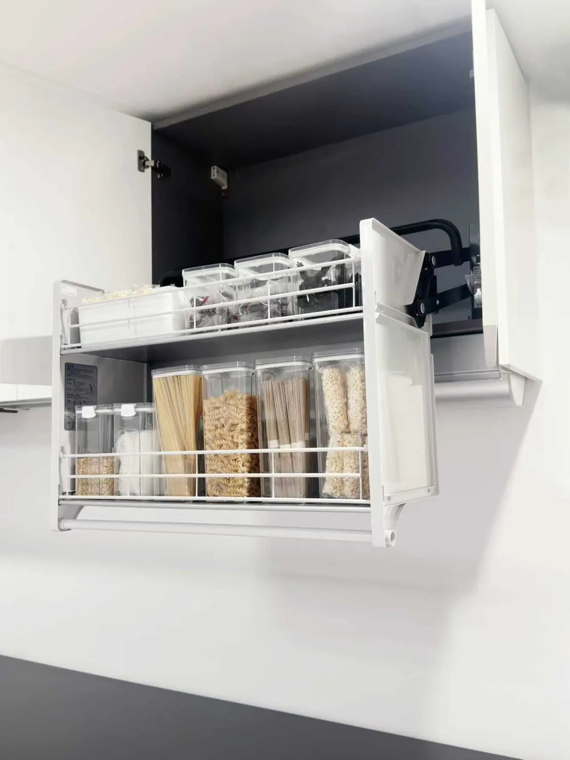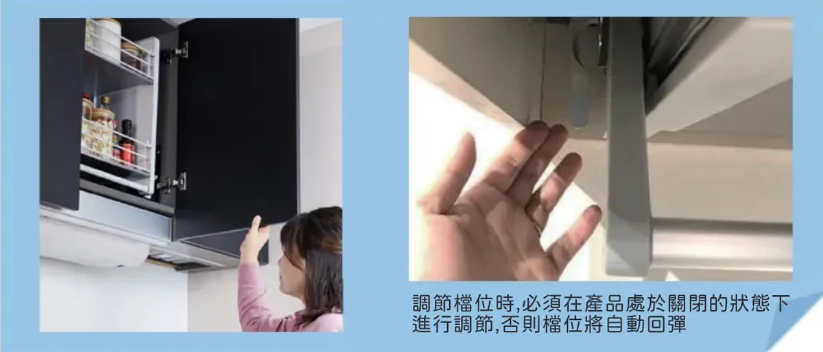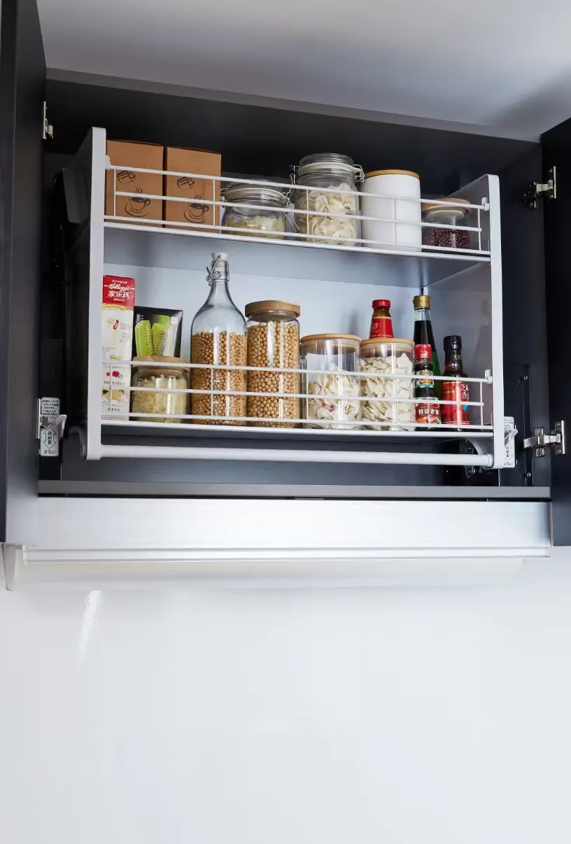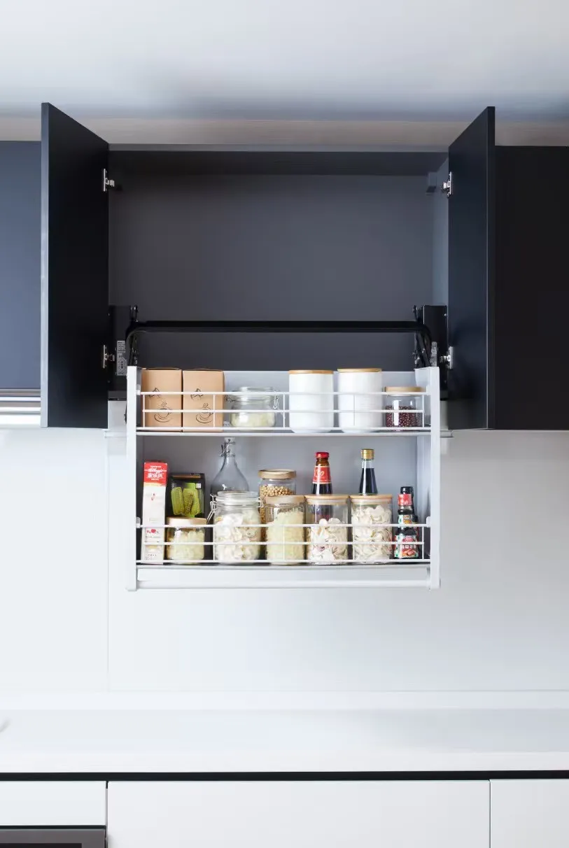 自由升降上方收納空間 提倡更安全便利的家居生活 提供安全高效的儲物空間·隨時隨手使用儲備物品,減少過期風險·可以通過調節來應對不同的乘載重量·帶有鎖定功能 解放雙手 使用更安全適用櫃寬900 mm | 灰色(DY-558374) 目前只供應規格W900,其他尺寸為期貨 請留意本產品適用櫃體內徑呎吋為: W870*D320~350*H570~900mm 應用範例