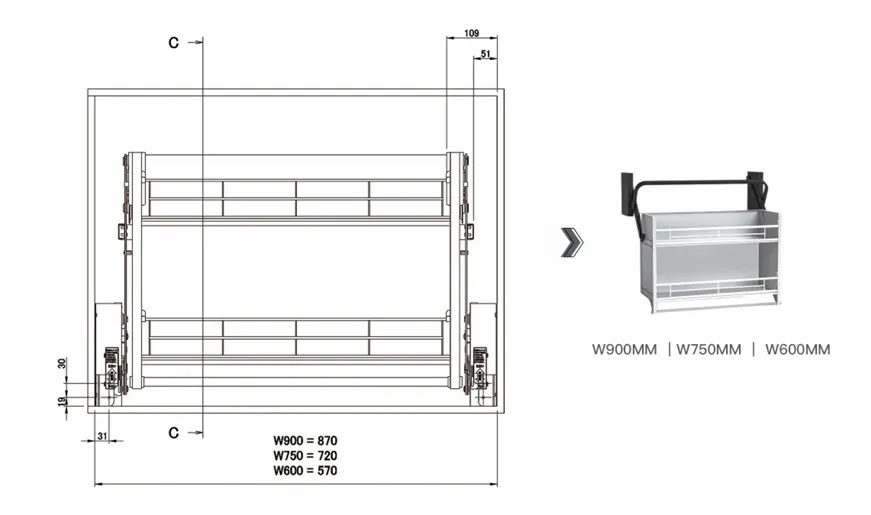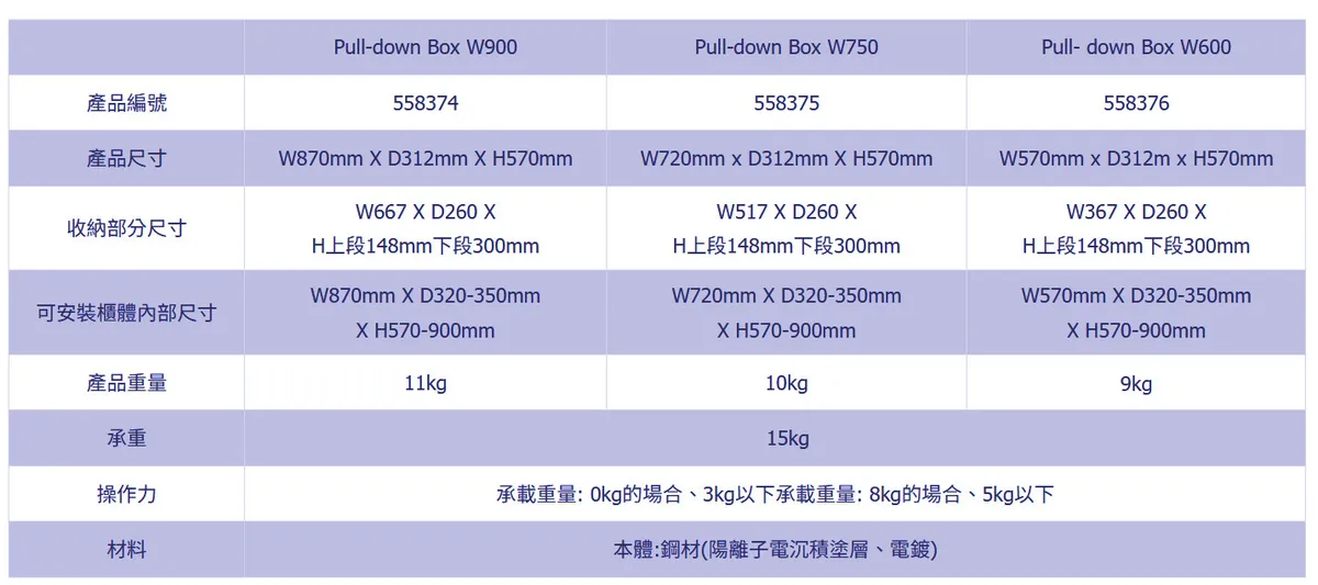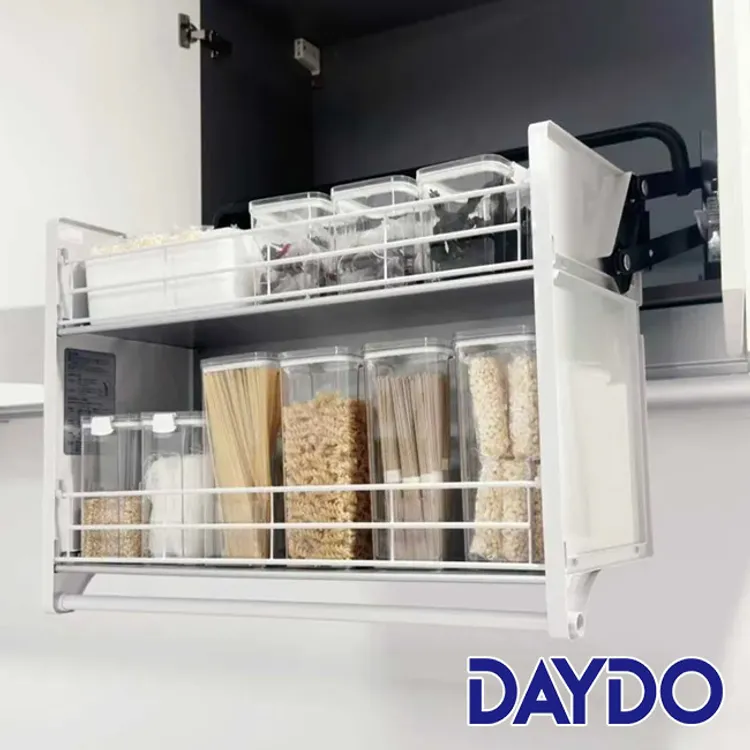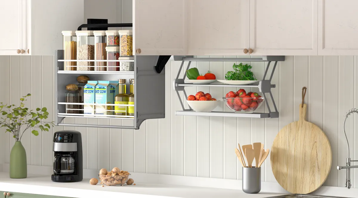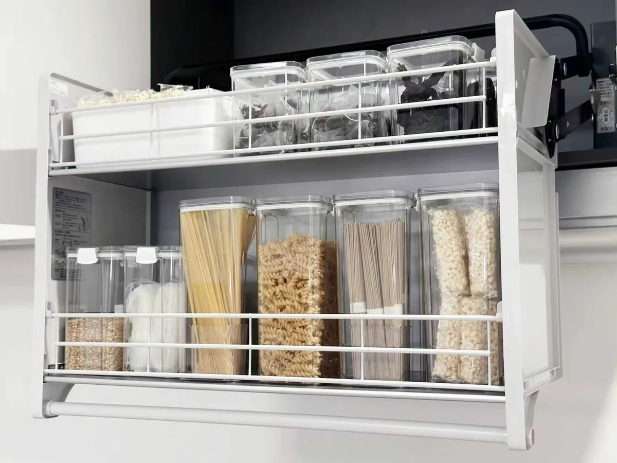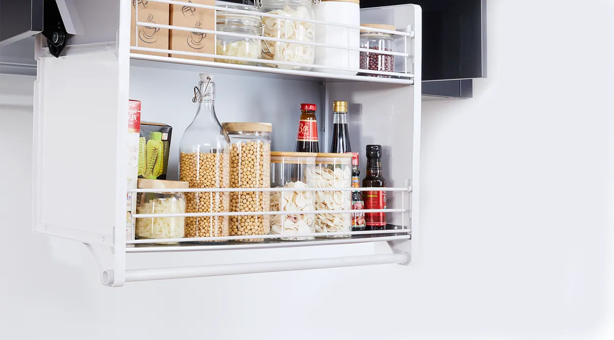 自由升降上方收納空間 提倡更安全便利的家居生活 提供安全高效的儲物空間·隨時隨手使用儲備物品,減少過期風險·可以通過調節來應對不同的乘載重量·帶有鎖定功能 解放雙手 使用更安全適用櫃寬900 mm | 灰色(DY-558374) 目前只供應規格W900,其他尺寸為期貨 請留意本產品適用櫃體內徑呎吋為: W870*D320~350*H570~900mm 應用範例