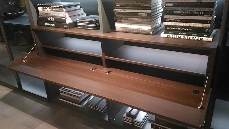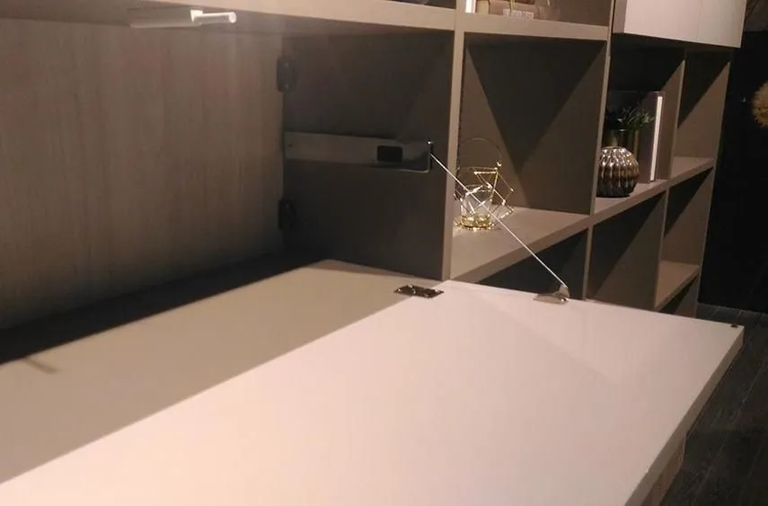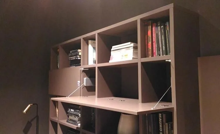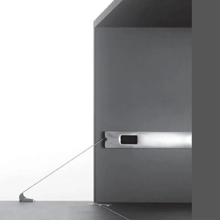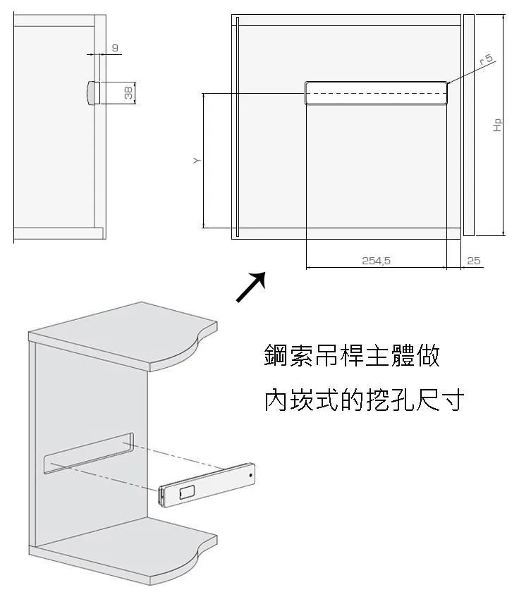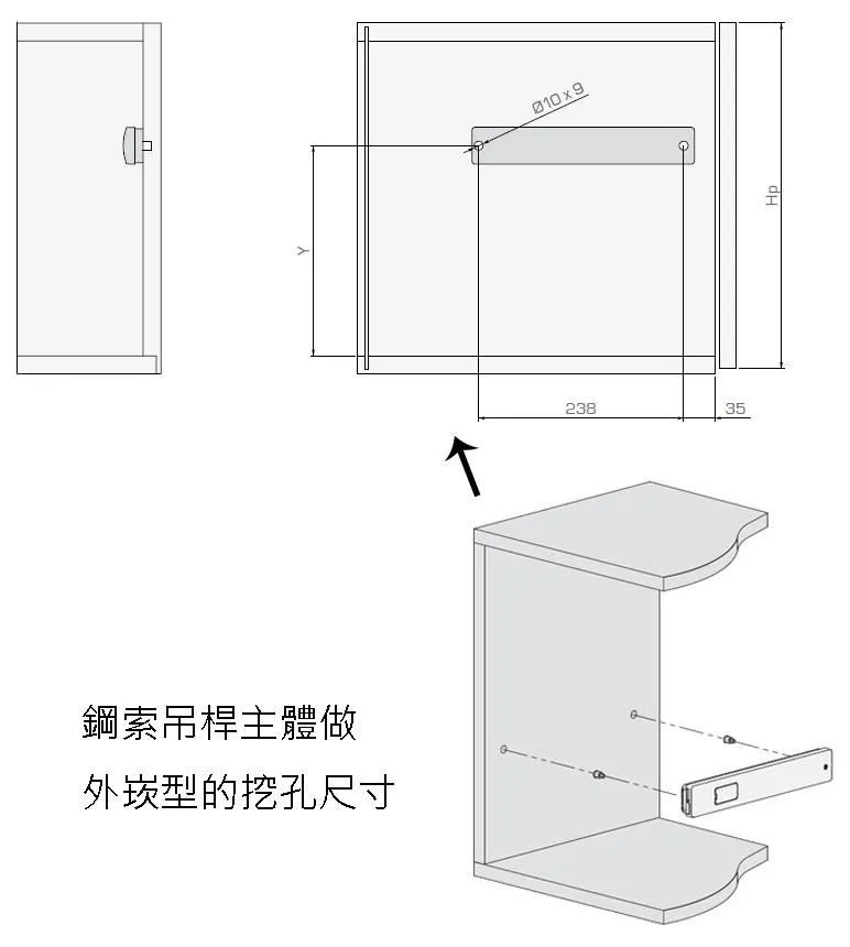歐洲進口重型下掀鋼索吊桿,適於用一般木作面板或粗鋁框面板,櫃體高度從20cm-48cm,視面板大小寬度搭配1支或2支鋼索吊桿。門片開啓時,有緩衝效果。門片開啓角度,可依需要做調整設定。吊桿主體可做埋入式或直接鎖螺絲固定於側板,有分左右邊,主體顏色為鋁色。 產品尺寸 應用範例