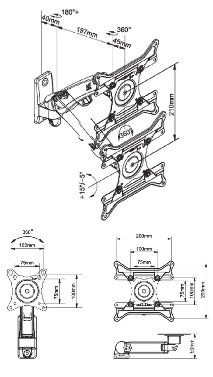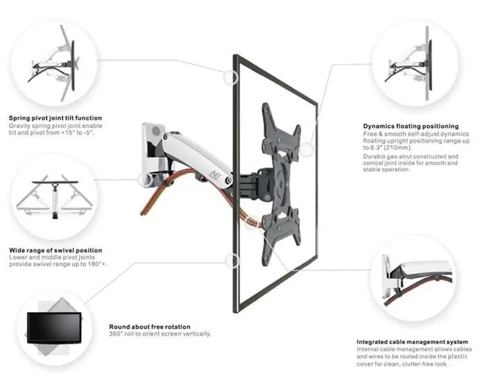 產品說明: 符合VESA規格 7.5×7.5cm、20 x 20cm。 適用30"~40" LCD。 可左右旋轉180°,俯仰往上5°往下10°。 材質: 航空鋁材 承重: 5~10kg。 離牆距離: 9~28.2cm。 ※本產品通過德國GS安全標準認證。 ※本公司產品通過ISO9001品質認證。