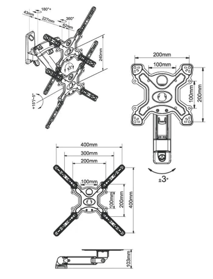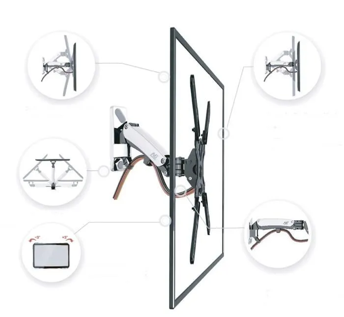 產品說明: 符合VESA規格 10 x 10cm、40 x 40cm。 適用40"~50" LCD。 可左右旋轉180°,俯仰往上7°往下8°。 材質: 航空鋁材 承重: 8~16kg。 離牆距離: 10.3~33.2kg。 ※本產品通過德國GS安全標準認證。 ※本公司產品通過ISO9001品質認證。