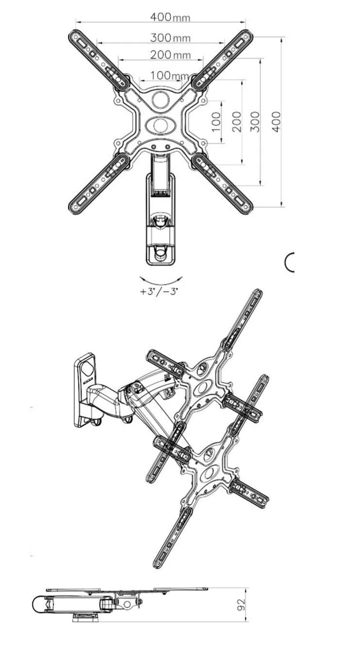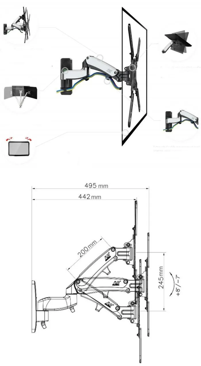 產品說明: 符合VESA規格 10 x 10cm、40 x 40cm。 適用40"~50" LCD。 可左右旋轉180°,俯仰往上7°往下8°。 材質: 航空鋁材 承重: 8~16kg。 離牆距離: 9.2~49.5kg。 ※本產品通過德國GS安全標準認證。 ※本公司產品通過ISO9001品質認證。
