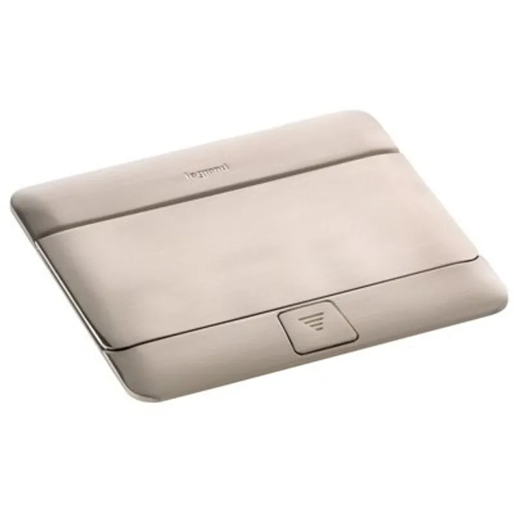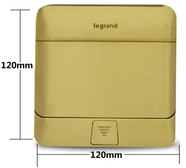 三模組緩衝兩用型插座,顏色選擇有不鏽鋼色(材質為鋅合金電鍍)、拉絲金(材質為黃酮)、鋁本色(材質為鋁)。尺寸為12*12*7.8cm。專用預埋盒尺寸為10.8*10.8cm。電壓為110V。。