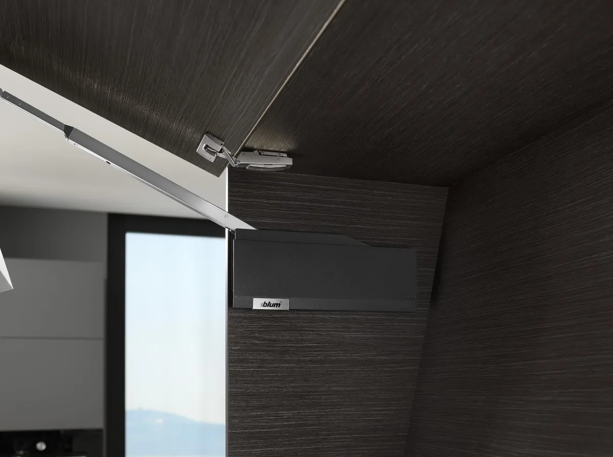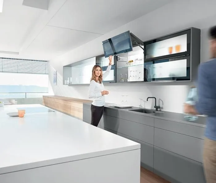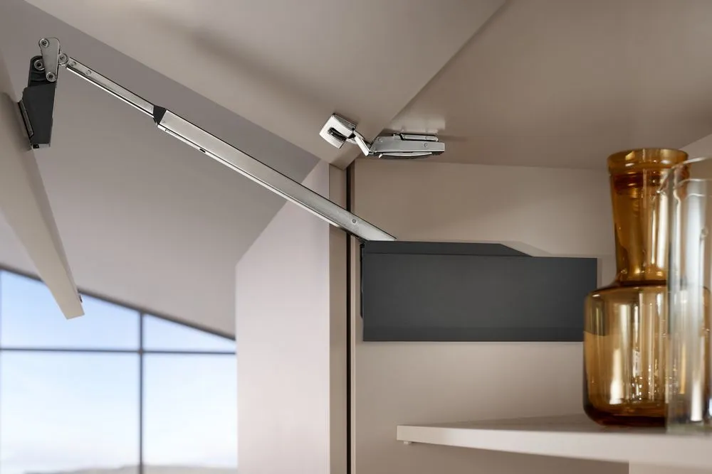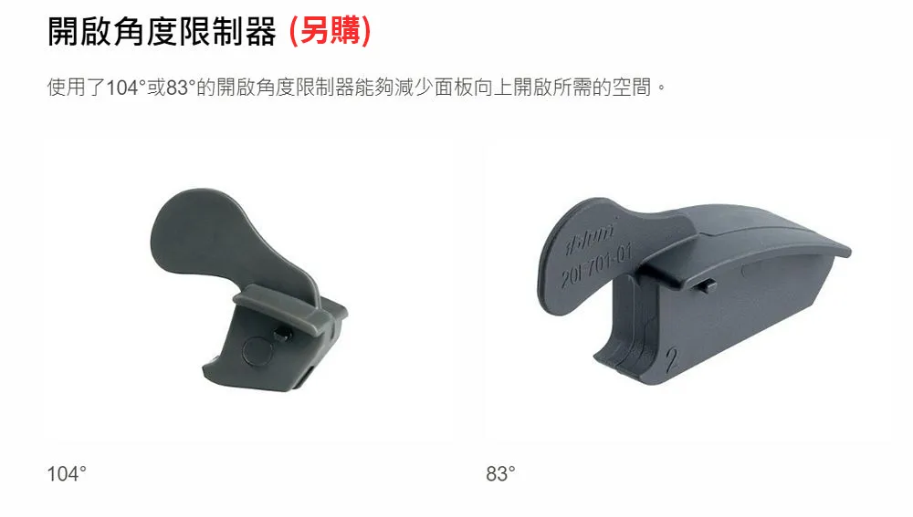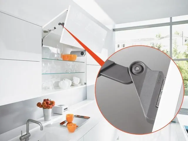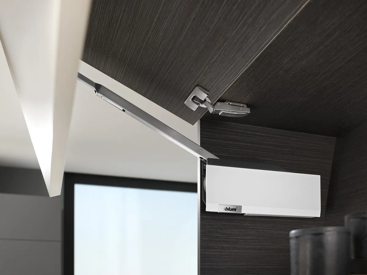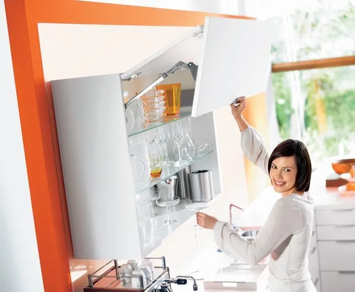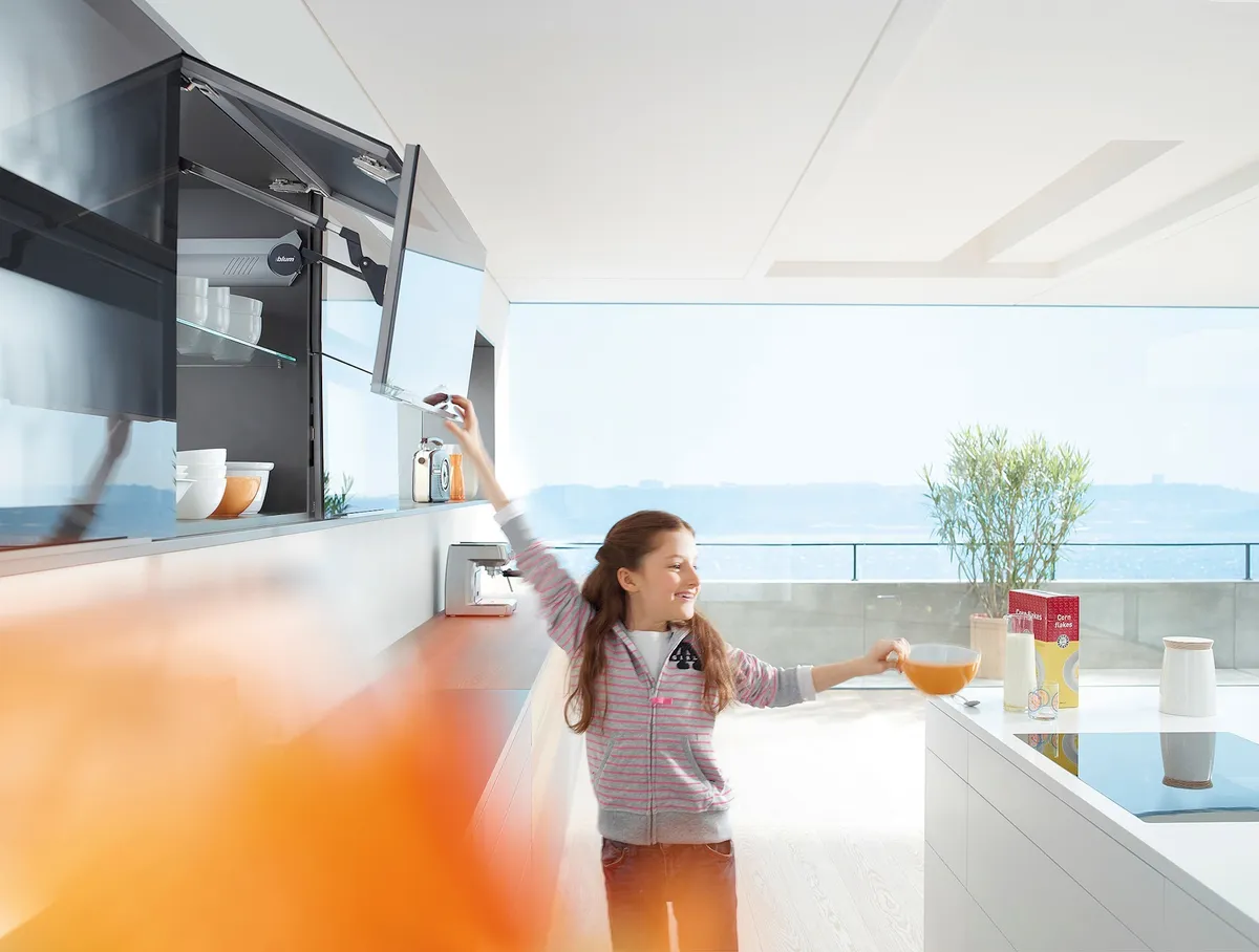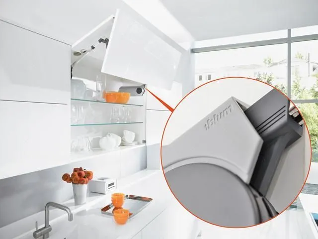 上掀折門只需微小的操作力,便可達到舒適開啟與輕柔關閉的效果。兩片折門可依設計,搭配不同材質與不同大小高度,不管是木作門,鋁框門還是其他金屬材質,blum上掀折門提供您許多設計的選擇。 另外具有防夾手與緩衝裝置,能提升廚具更多地安全與品質。